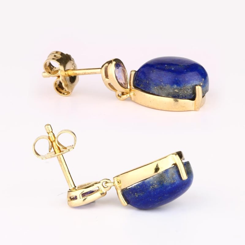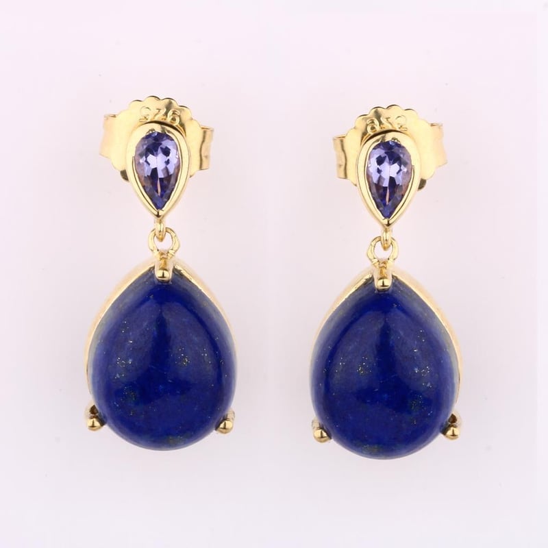 Lapis and Tanzanite Elegance: A Pair of Striking EarringsIndulge your senses with these exquisite earrings that effortlessly blend the deep celestial hues of lapis lazuli and the enchanting allure of tanzanite. Each earring features two stunning lapis cabochon pears, meticulously cut to a generous 11x9mm, showcasing the stone's rich royal blue tones interspersed with golden flecks, reminiscent of a starry night sky. Complementing the lapis are two delicate tanzanite pear drops, measuring 5x3mm, which radiate a captivating violet shimmer. Known for their rarity and ethereal beauty, tanzanites are a symbol of serenity and balance, making these earrings not just a piece of jewelry but a statement of elegance and sophistication.Crafted with precision, these push post earrings offer both comfort and security, allowing you to wear them from day to night. Whether you’re attending a gala or enjoying a casual evening out, these earrings are the perfect accessory to elevate any ensemble. Embrace the luxury of natural gemstones and let their vibrant colors speak for themselves in this stunningly crafted pair. Don’t miss the chance to own a piece that embodies both timeless beauty and modern elegance.