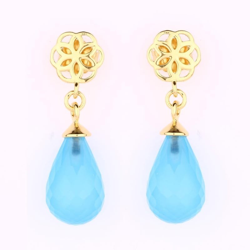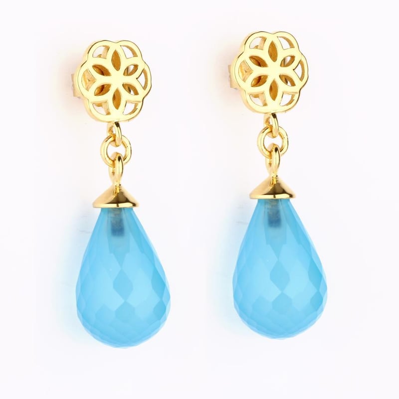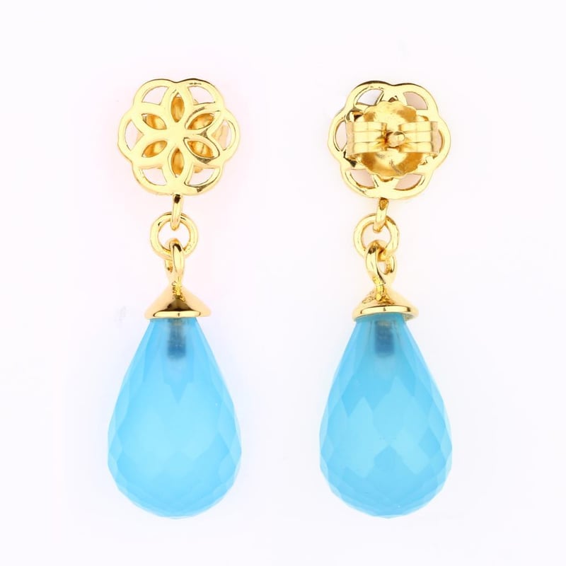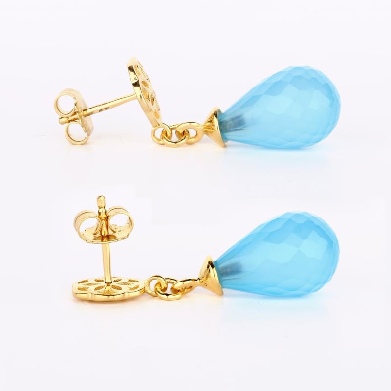 Enchanting Dyed Sea Blue Chalcedony Briolite Drop EarringsDive into elegance with these captivating earrings, featuring exquisite dyed sea blue chalcedony briolite drops. Each piece, measuring a delicate 15x10mm, captures the enchanting essence of the ocean, exuding a tranquil and refreshing aura. The total length of 3.40 cm allows for a graceful sway, perfect for enhancing your natural beauty.Adorned with striking 9.00mm symbol metal disks, these earrings offer a blend of contemporary design and timeless allure. The disks, with a thickness of 1.50mm, add a touch of sophistication, creating a stunning contrast against the vibrant chalcedony. Crafted with a secure push post fastening, these earrings are not only a statement of style but also a testament to quality craftsmanship. Ideal for both daytime elegance and evening glamour, these earrings are a must-have addition to your jewelry collection. Embrace the ocean’s charm and let every moment sparkle with these exquisite sea blue chalcedony briolite drop earrings.