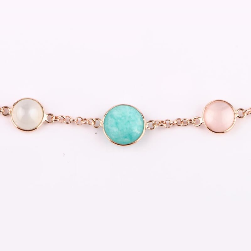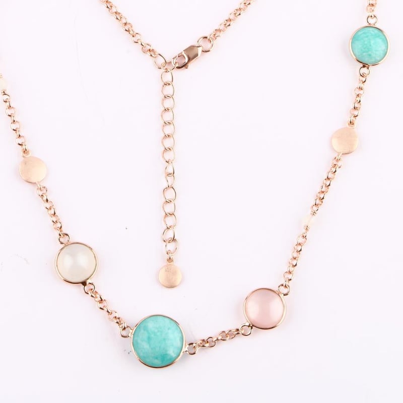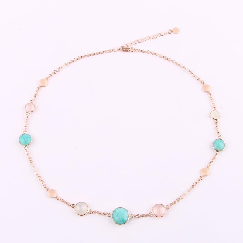 Exquisite Pastel Gemstone Necklace: A Symphony of Color and Elegance Indulge in the serene beauty of this enchanting pastel gemstone necklace, an exquisite piece that captures the essence of nature's softest hues. Crafted with a harmonious blend of Amazonite, Rose Quartz, and White Moonstone, this necklace features a stunning array of carefully selected gemstones that evoke tranquility and sophistication. At the heart of this masterpiece, you will find a captivating 11.00mm almond-shaped Amazonite, radiating a gentle pastel glow. Complementing it are two matching 8.50mm Amazonite pieces, the perfect embodiment of refined grace. The delicate allure of Rose Quartz is showcased with one 8.50mm and one 6.80mm almond-shaped stone, each delivering a soft blush that whispers romance and warmth. Adding to the tranquil palette, the necklace showcases two exquisite White Moonstone cabochons, one measuring 8.50mm and the other 6.80mm, each exuding an ethereal glow that dances with light, reminiscent of a moonlit night. The artistry continues with four meticulously crafted 3.00mm White Moonstone plain beads, elegantly spaced with a 1.50cm gap between each stone and motif, enhancing the overall design. The brushed texture discs, measuring 6.00mm, introduce a contemporary twist, while the matte finish plain metal logo tag adds a touch of modern elegance. With a total length of 42cm plus a 5cm extender, this necklace is perfectly designed to grace your neckline, ensuring versatility for any occasion. The durable metal rollo chain with a secure lobster lock guarantees both style and functionality. Elevate your jewelry collection with this luxurious pastel gemstone necklace, a true testament to craftsmanship and beauty that will capture hearts and turn heads wherever you go.
