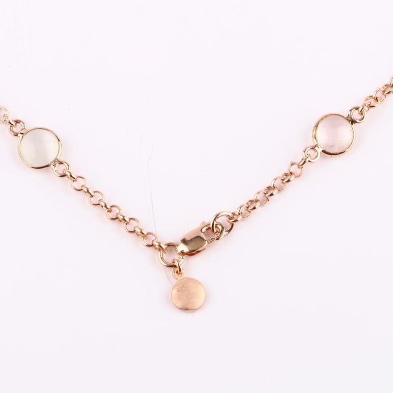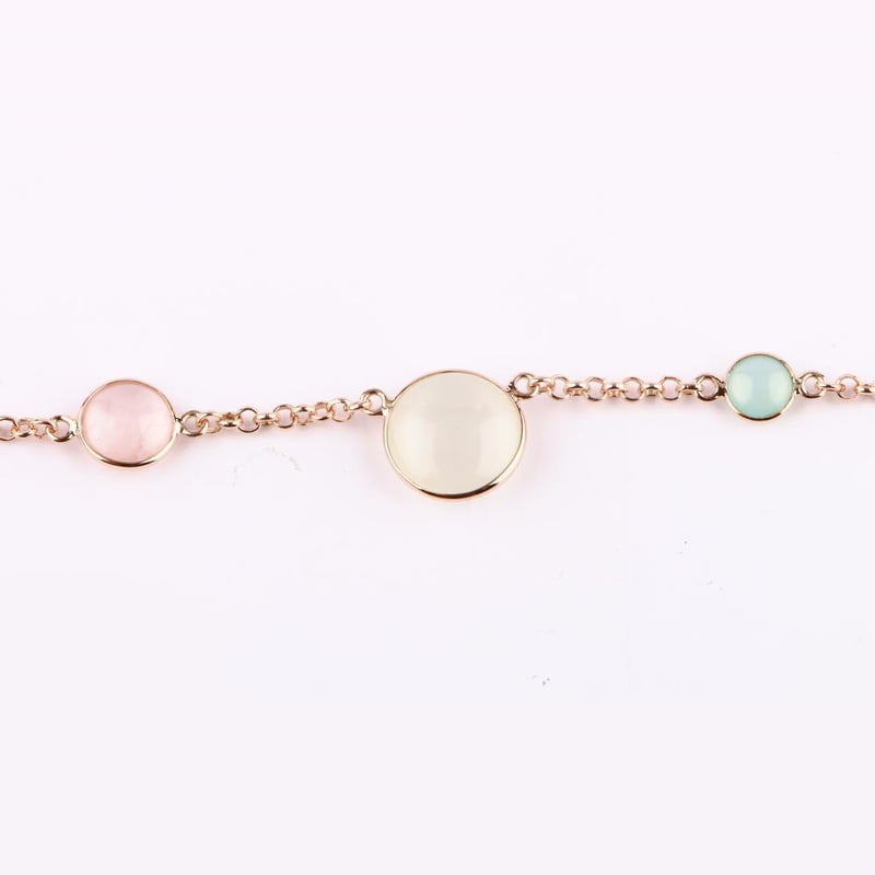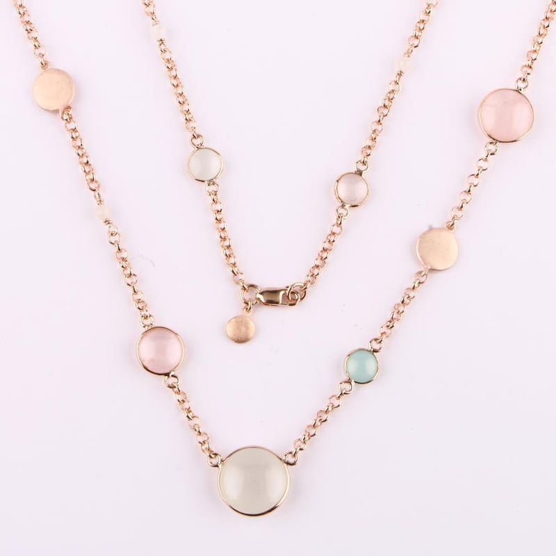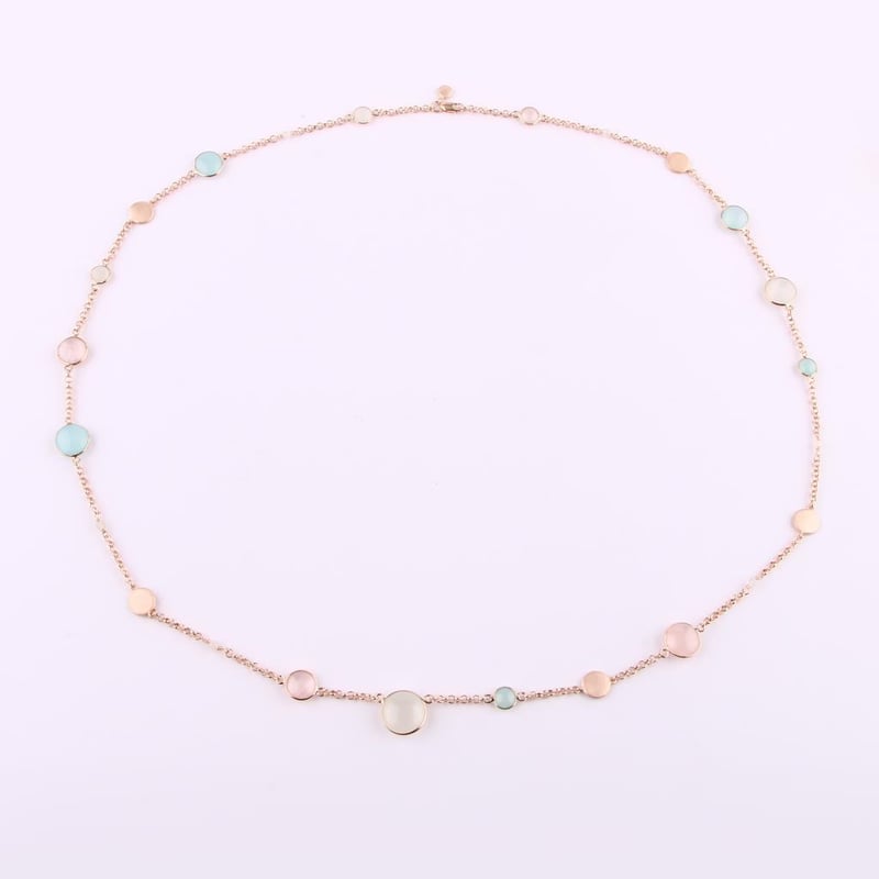 Ethereal Elegance: Pastel Moonstone, Sea Blue Chalcedony, and Rose Quartz Jewelry SetIndulge in a harmonious blend of nature’s most exquisite treasures with this enchanting jewelry set, featuring a stunning array of gemstones that evoke the serene beauty of a tranquil dawn. Each piece is meticulously crafted, showcasing the delicate allure of pastel-colored White Moonstone, soothing Sea Blue Chalcedony, and romantic Rose Quartz, all presented in the elegant almond (Idli) shape.The set includes four captivating White Moonstone beads, each a radiant testament to the gem’s mystical charm. The 12.00mm and 10.00mm rounds are perfect for statement pieces, while the smaller 6.00mm versions add a touch of subtle sophistication. Their ethereal glow captures light effortlessly, creating an enchanting play of colors reminiscent of a moonlit night.Complementing this collection are the enchanting Sea Blue Chalcedony beads, known for their calming energy and tranquil hue. The set features two 10.00mm and two 9.00mm rounds, alongside two petite 6.00mm accents, each exuding an unprocessed, natural beauty that invites serenity and peace.Lastly, the gentle warmth of Rose Quartz is embodied in this collection with one 10.00mm, one 9.00mm, one 8.00mm, and one 6.00mm round bead. Each Rose Quartz piece radiates love and compassion, making it a cherished addition to any jewelry lover's collection.Completing this mesmerizing ensemble is a stunning necklace made of 3.00mm full-drilled White Moonstone beads, elegantly spaced with brushed texture discs. The necklace stretches a graceful 70cm with an additional 5cm extender, ensuring the perfect fit. Crafted with a durable metal rollo chain and secured with a lobster lock, it is designed for both style and longevity.This jewelry set is an exquisite confluence of elegance and nature’s beauty, perfect for elevating any look, from casual to formal. Own this collection today, and let the ethereal tones of pastel gemstones weave a tapestry of serenity and sophistication in your jewelry wardrobe.