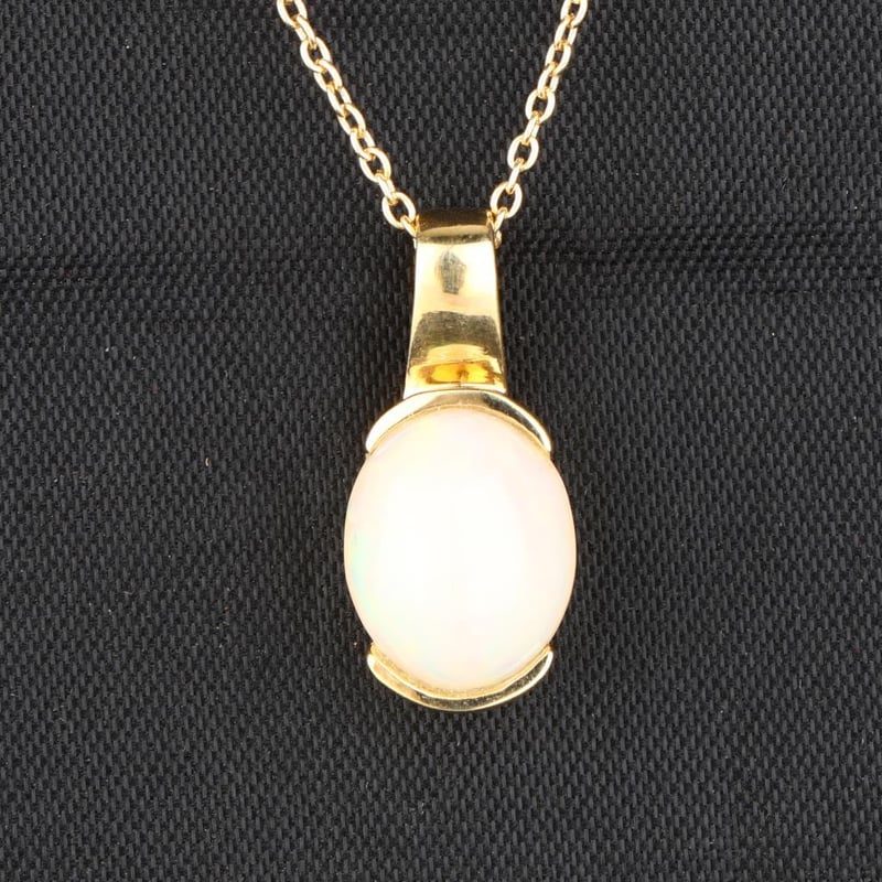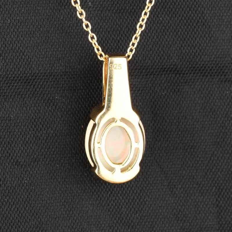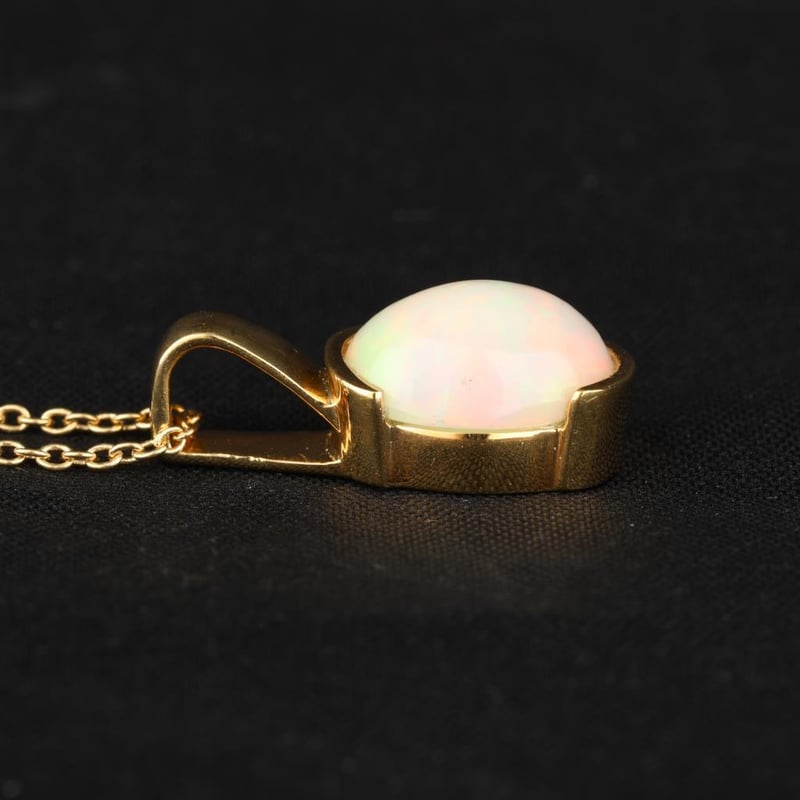 Ethiopian Opal Elegance: Captivating Oval Pendant Introducing a breathtaking Ethiopian Opal cabochon, perfectly cut into an exquisite 11x9mm oval shape, designed to captivate the senses and elevate any jewelry collection. This stunning piece features an enchanting play of color, where vibrant hues dance across the surface, reminiscent of a serene sunset reflected on a tranquil lake. Meticulously crafted, the pendant is designed with a J back for seamless integration into your favorite chain or necklace. The bail opening of 4.50mm ensures effortless pairing with a variety of styles, while the carefully considered metal weight, without cable, stands at a delicate 1.50 grams, making it a lightweight yet striking addition to your ensemble. Whether worn for a special occasion or as a statement piece in your everyday wardrobe, this Ethiopian Opal pendant radiates sophistication and charm. Embrace the allure of this unique gemstone and let its ethereal beauty illuminate your jewelry collection. Bid now and make this extraordinary pendant yours, a true testament to elegance and style.