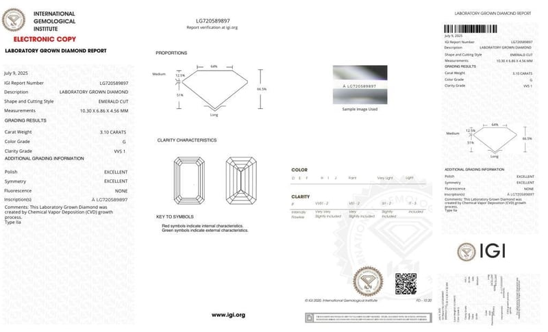3.10 CARAT EMERALD CUT DIAMOND G/VV 3.10 Carat Emerald Cut Diamond G/Vvs1 Igi Certificate # Lg 720589897 Laser Inscribed : Labgrown Igi Lg 720589897 Polish : Excellent Symmetry : Excellent Flourescence : None Type : Cvd Condition: Good - Refer Images 0488974+62