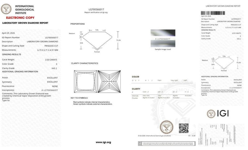 2.03 CARAT PRINCESS CUT DIAMOND E/V 2.03 Carat Princess Cut Diamond E/Vvs2 Igi Certificate # Lg 700566017 Laser Inscribed : Labgrown Lg 700566017 Polish : Excellent Symmetry : Excellent Flourescence : None Type : Cvd Condition: Good - Refer Images 0488974+17