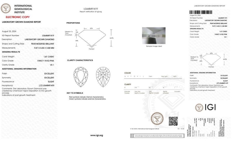 1.41 CARAT PEAR SHAPED DIAMOND FANCY 1.41 Carat Pear Shaped Diamond Fancy Vivid Pink /Vs1 Igi Certificate # Lg 648491419 Laser Inscribed : Labgrown Igi Lg 648491419 Polish : Excellent Symmetry : Excellent Flourescence : Slight Type : Cvd Condition: Good - Refer Images 0488974+68