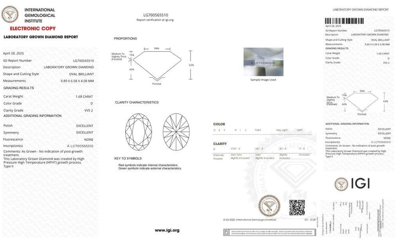 1.68 CARAT OVAL SHAPE DIAMOND D/VVS 1.68 Carat Oval Shape Diamond D/Vvs2 Igi Certificate # 700565510 Laser Inscribed : Labgrown Igi 700565510 Polish : Excellent Symmetry : Excellent Flourescence : None Type : Hpht Condition: Good - Refer Images 0488974+6