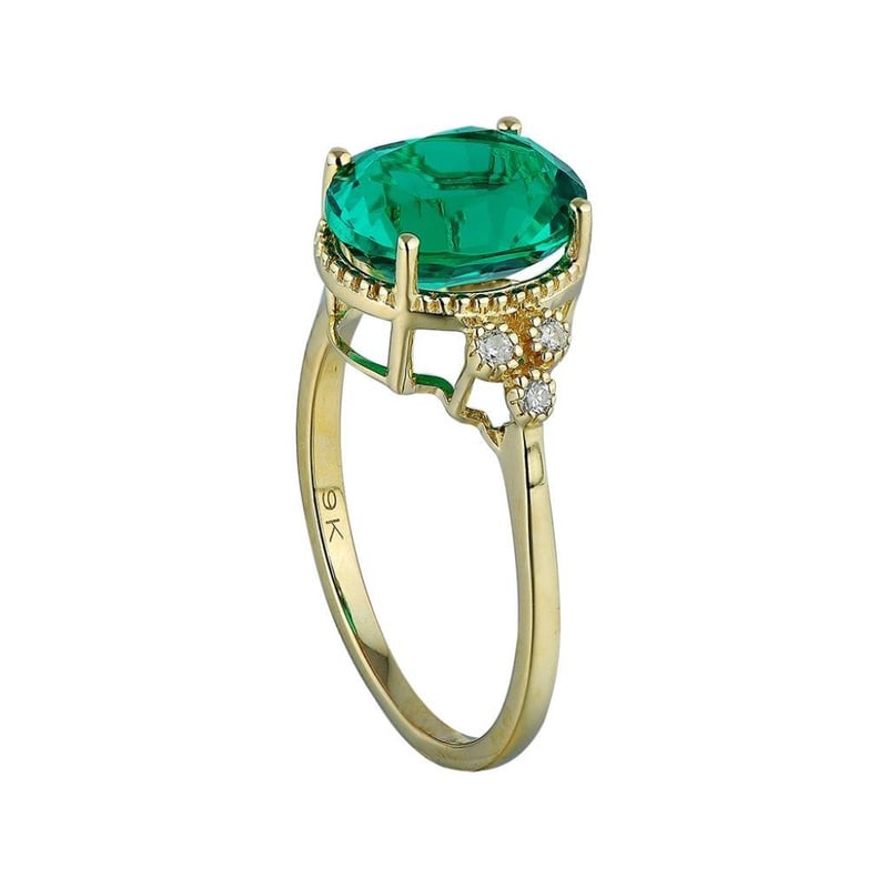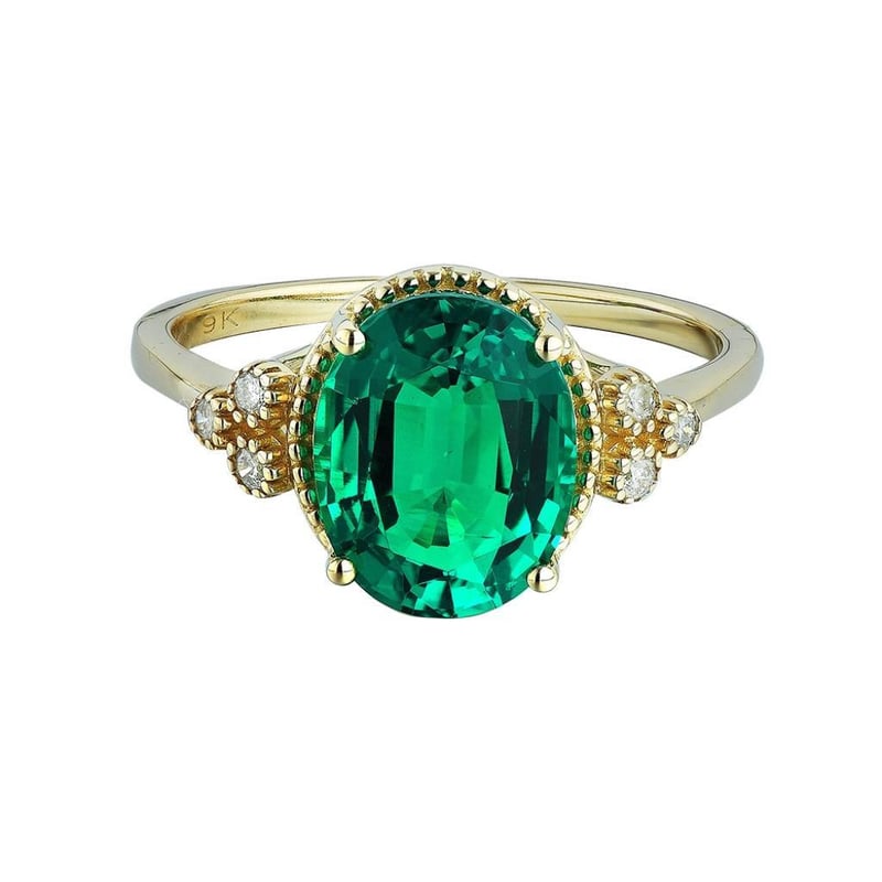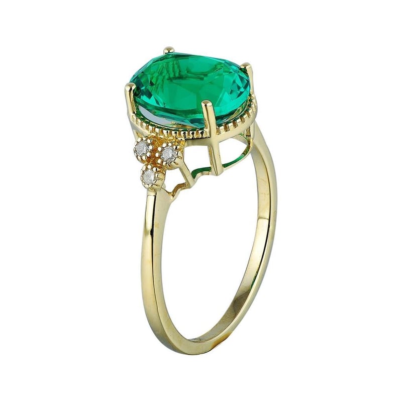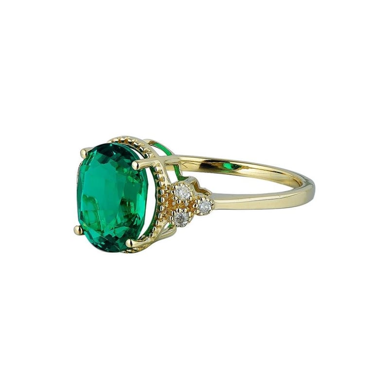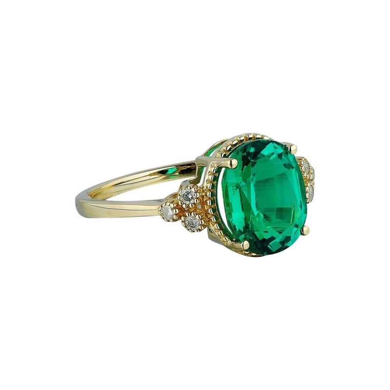 2.74 CARAT LAB GROWN EMERALD AND 2.74 Carat Lab Grown Emerald And Diamond Solid Gold Ring 1 Lab Grown Emerald = 2.66 6 Diamonds = 0.08 Ring Weight = 2.45 Grams Condition: Good - Refer Images 0488974+109