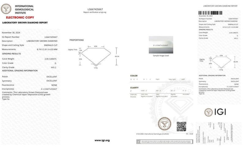 2.05 CARAT EMERALD CUT DIAMOND 2.05 Carat Emerald Cut Diamond G/Vvs2 Igi Certificate # Lg 667435667 Laser Inscribed : Labgrown Igi Lg 667435667 Polish : Excellent Symmetry : Excellent Flourescence : None Type : Cvd Condition: Good - Refer Images 0488974+49