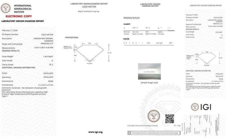 1.44 Carat Princess Cut Diamond D/Vs2 Igi Certificate # 621447294 Laser Inscribed : Labgrown Igi 621447294 Polish : Excellent Symmetry : Excellent Flourescence : None Type : Hpht