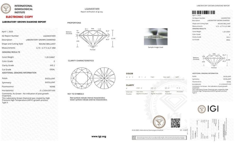 1.20 CARAT ROUND BRILLIANT DIAMOND 1.20 Carat Round Brilliant Diamond E/Vvs2 Igi Certificate # Lg 694597499 Laser Inscribed : Labgrown Igi Lg 694597499 Cut : Ideal Polish : Excellent Symmetry : Excellent Flourescence : None Type : Hpht Condition: Good - Refer Images 0488974+135