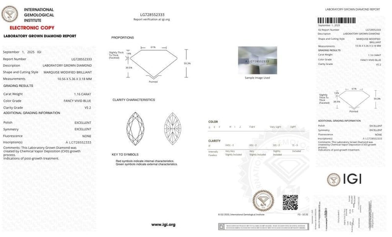 1.16 Carat Marquise Cut Diamond Fancy Vivid Blue /Vs2 Igi Certificate # Lg 728552333 Laser Inscribed : Labgrown Igi Lg 728552333 Polish : Excellent Symmetry : Excellent Flourescence : None Type : Cvd