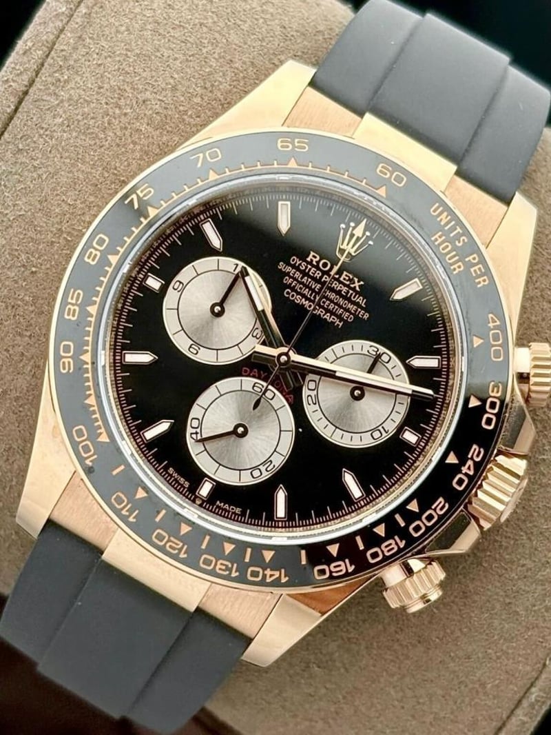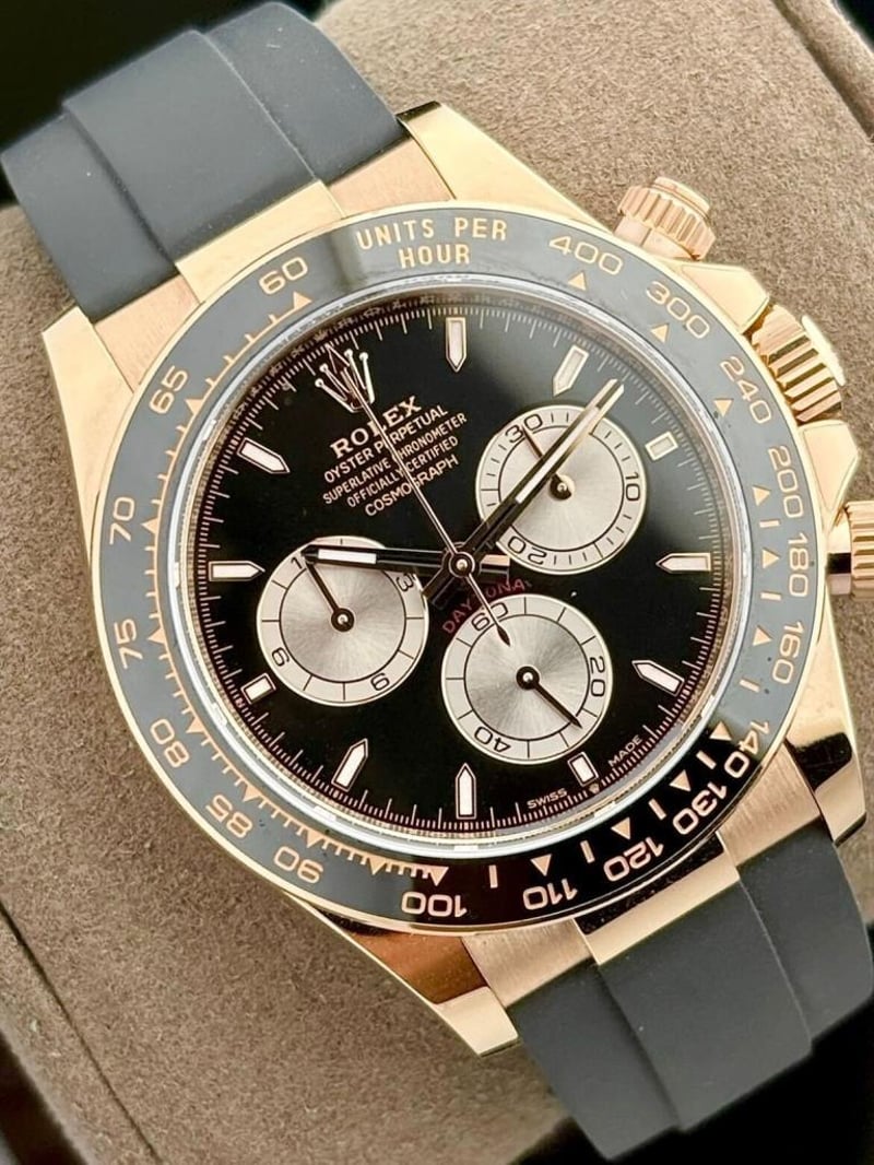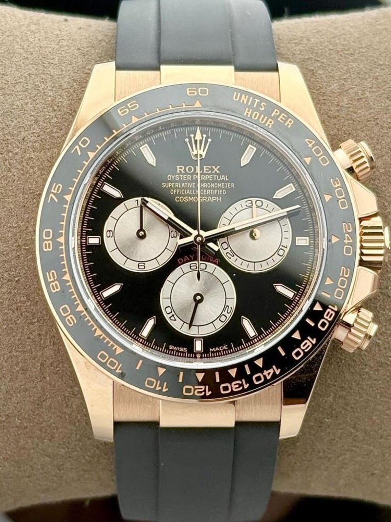 2024 ROLEX DAYTONA COSMOGRAPH ROSE GOLD BLACK DIAL 40MM Brand : RolexReference : 126515LnModel : DaytonaYear : 2024Case Size : 40MmPower Reserve : 72HDial : BlackBezel : CeramicCase : Rose GoldBracelet : RubberPapers : YesBox : Yes Condition: Good - Refer Images 0488417+13