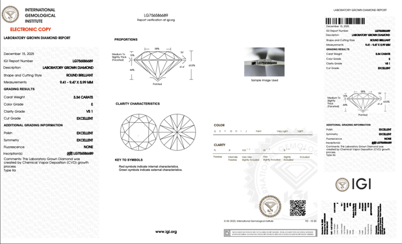 3.34CT ROUND E VS1 LAB GROWN DIAMOND Accompanied By Igi & Inscripted Report Number Igi - 756586689 Condition: Good - Refer Images 0163049+18CROSS DOCK