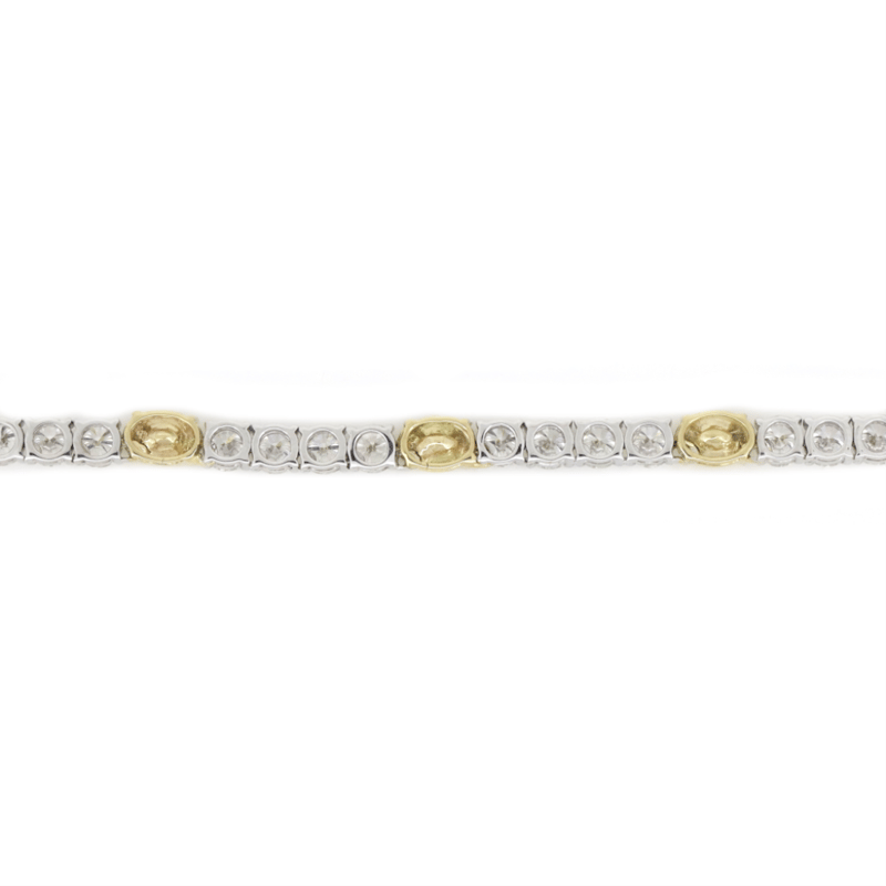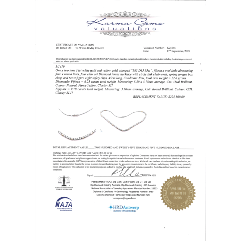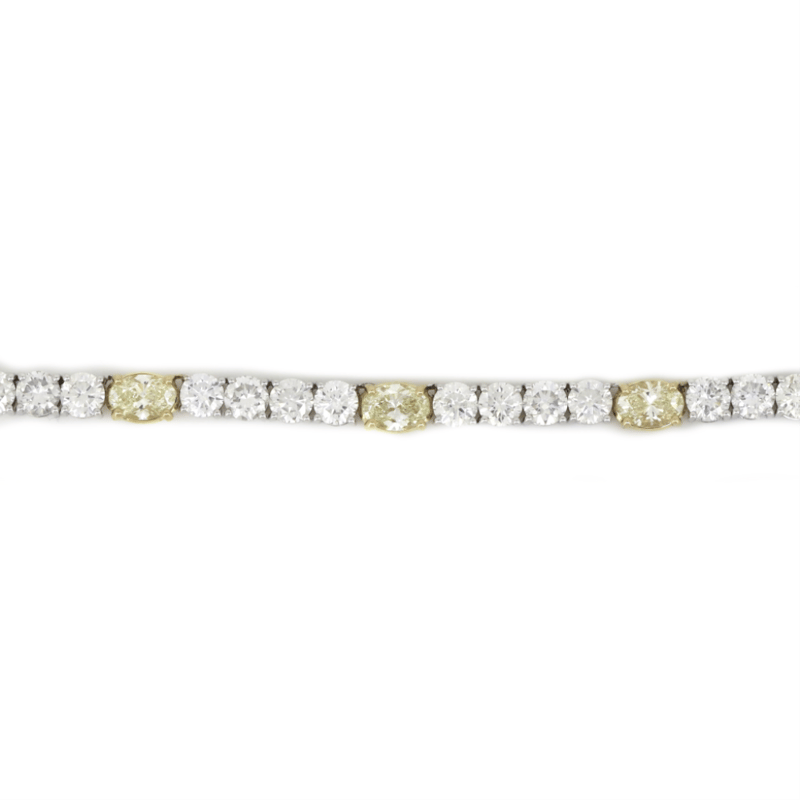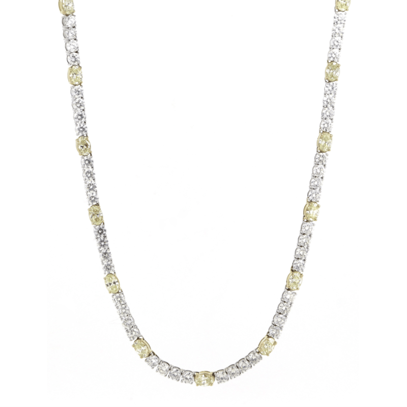 The Design Features, 15 Oval Brilliant Cut, Fancy Yellow, Diamonds (6.25Ct Tdw, Si1 Clarity), Claw Set At Intervals. Set Between Are, 56 Round Brilliant Cut, Diamonds (9.70Ct Tdw, G-H Colour, Si-I1 Clarity), Claw Set In A Single Row. The Necklace Has A Box Lock Clasp With 2 Figure Eight Safety Clips. Necklace Length Is 45Cm.