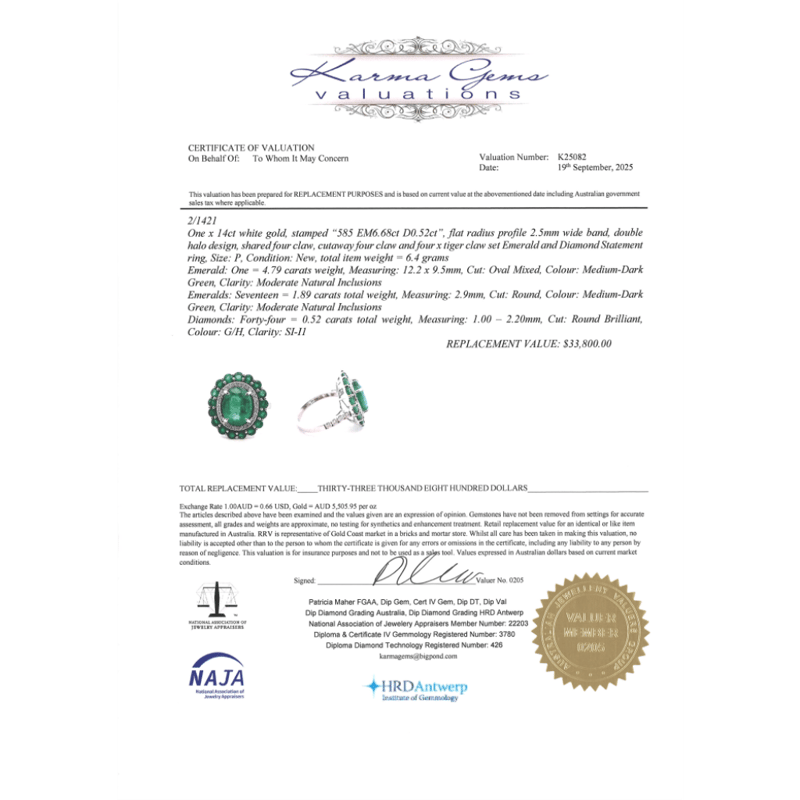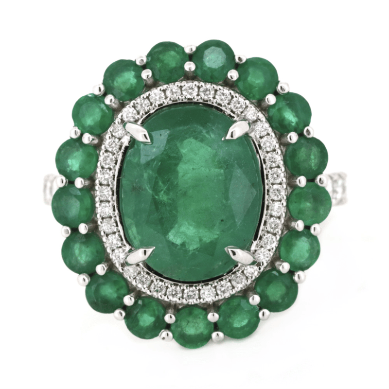 The Centre Features, One Oval Faceted Cut, Medium-Dark Green, Emerald (4.79Ct, Moderate Inclusions), Claw Set. Surrounding The Centre In A Halo And Decorating The Band Are, 44 Round Brilliant Cut, Diamonds (0.52Ct Tdw, G-H Colour, Si-I1 Clarity), Claw Set. Decorating The Outer Halo Are, 17 Round Brilliant Cut, Medium-Dark Green, Emeralds (1.89Ct Tsw, Moderate Inclusions), Claw Set. Ring Size P.