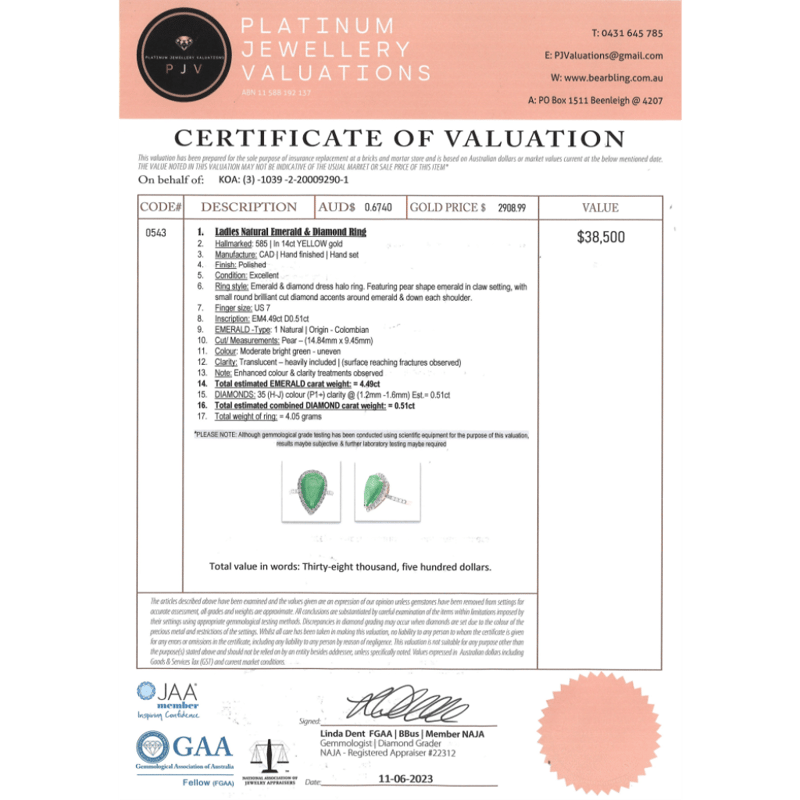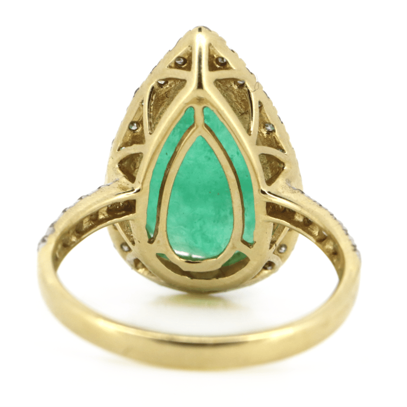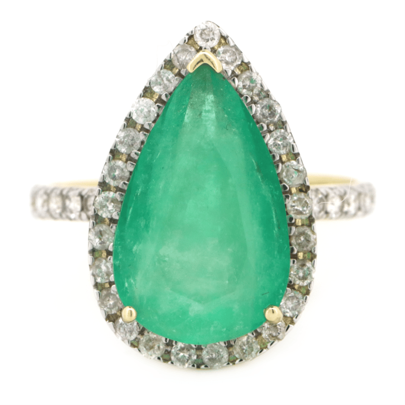 The Centre Features, One Pear Cut, Moderate Bright Green, Colombian Emerald (4.49Ct, Heavily Included), Claw Set. Encompassing The Design Are, 35 Round Brilliant Cut, Diamonds (0.51Ct Tdw, H-J Colour, P1+ Clarity), Bead Set. Ring Size N.