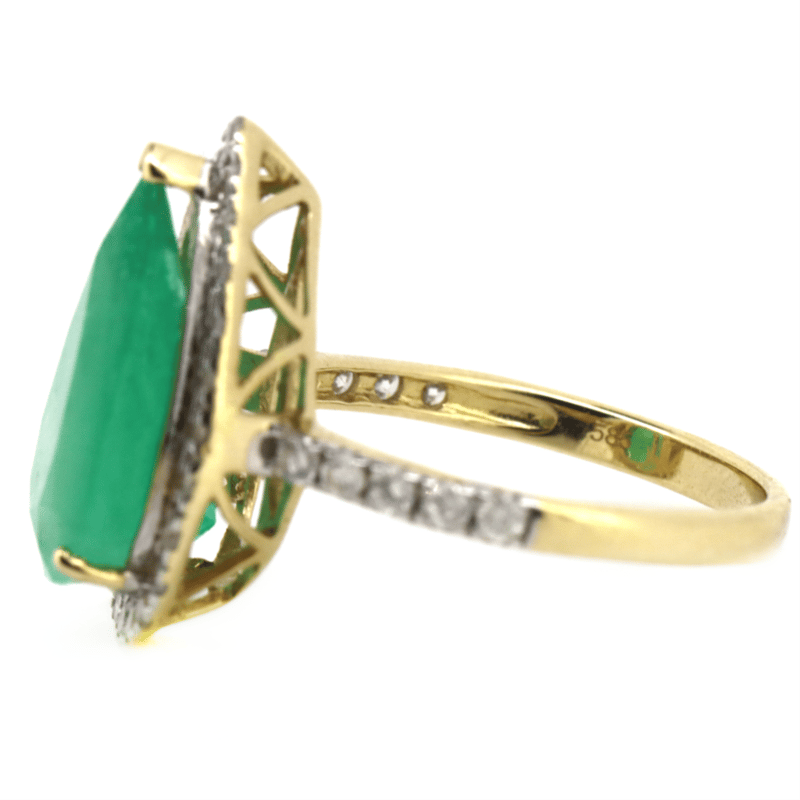 14K YELLOW GOLD, 4.49CT COLOMBIAN EMERALD AND DIAMOND, HALO RING.