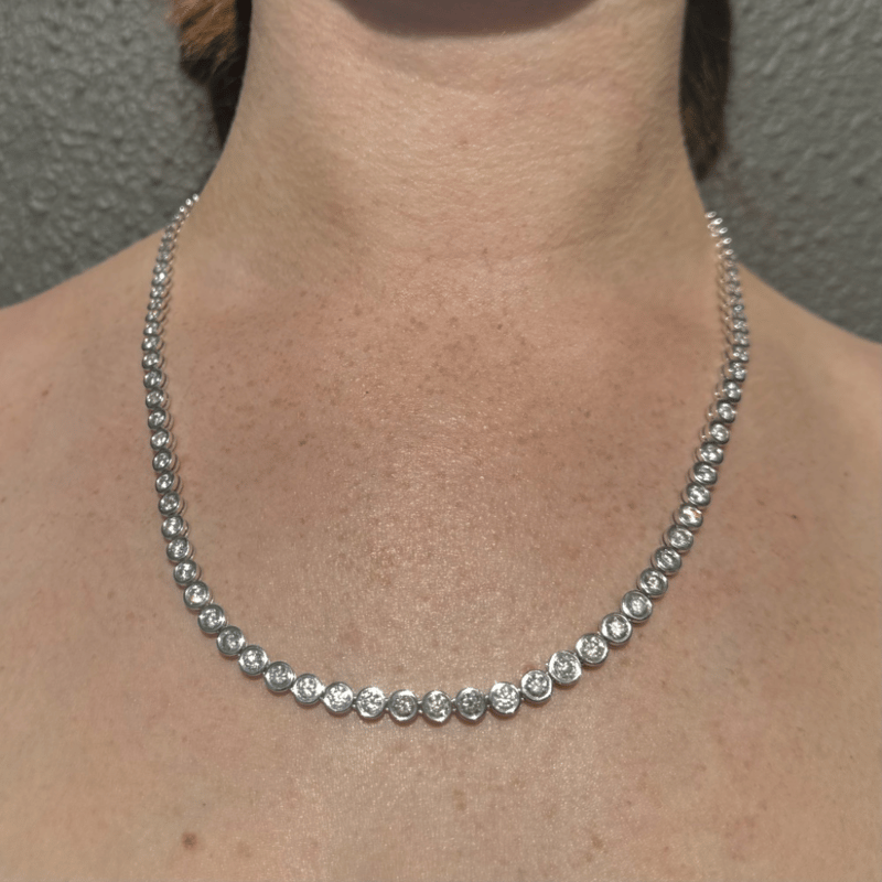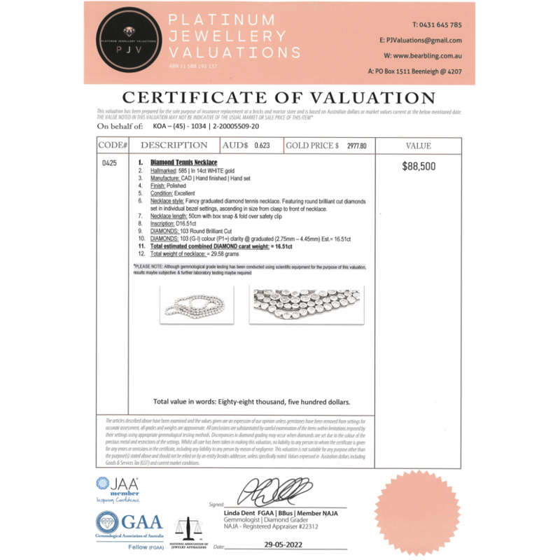 14K WHITE GOLD, 16.51CT TDW DIAMOND, RIVIERA NECKLACE.