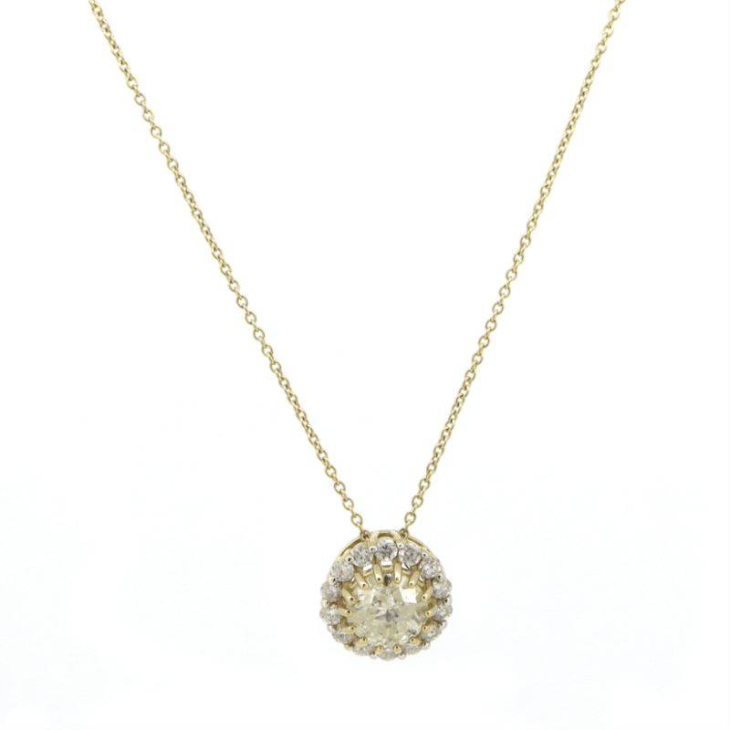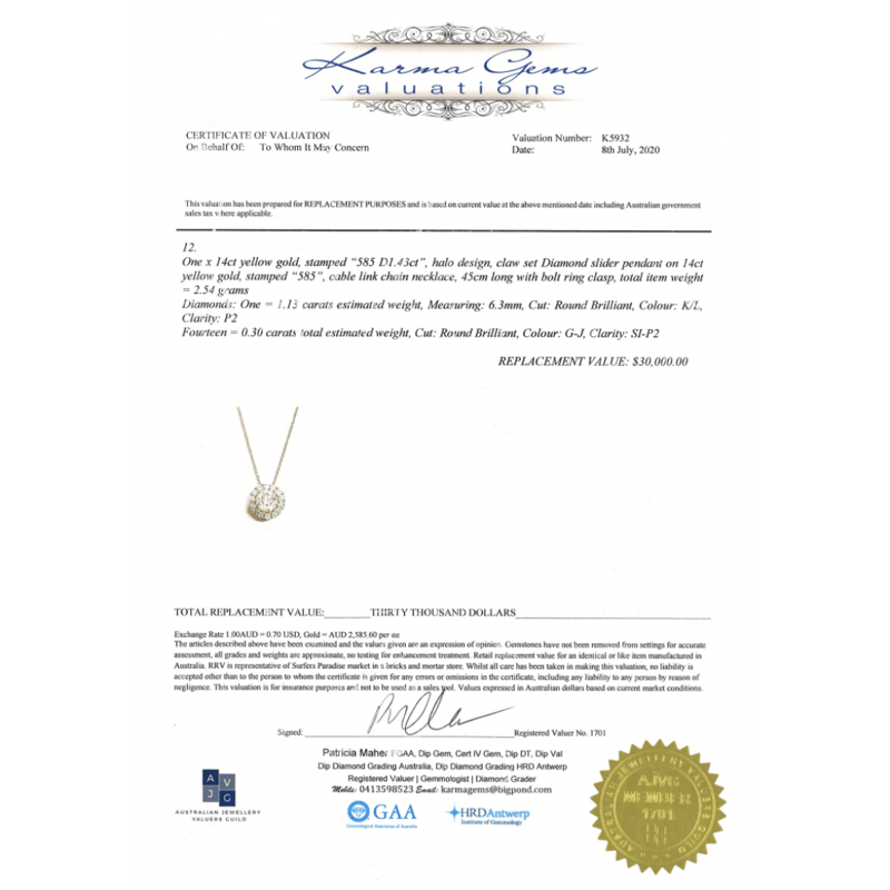 14K YELLOW GOLD AND DIAMOND, HALO NECKLACE. The Pendant Features, One Round Brilliant Cut, Diamond (1.13Ct, K-L Colour, P2 Clarity), Multi-Claw Set. Surrounding The Centre In A Halo Are, 14 Round Brilliant Cut, Diamonds (0.30Ct Tdw, G-J Colour, Si-P2 Clarity), Claw Set. The 14K Yellow Gold Necklace Has A Bolt Ring Clasp. Chain Length Is 45Cm. Valuations Provided by an Independent Third-Party Professional Not Directly Associated With Lloyds Auctions at AUD $$30,000.00This valuation has been conducted by an independent third-party professional. The valuation amount is an assessment by the issuing valuer and does not reflect the auction value of the item. Any inquiries regarding the valuation should be directed to the issuing valuer (refer to contact details on the certificate), as Lloyds Auctions has no affiliation or influence over the valuation, the valuer, or the stated amount. Condition: Good - Refer Images 0645904+5030