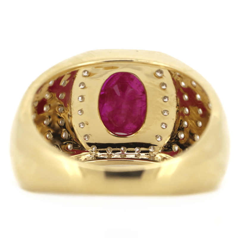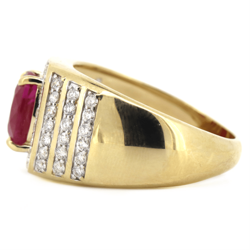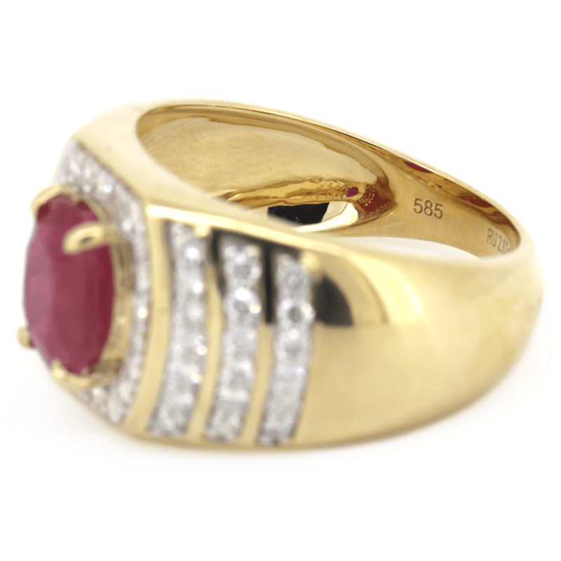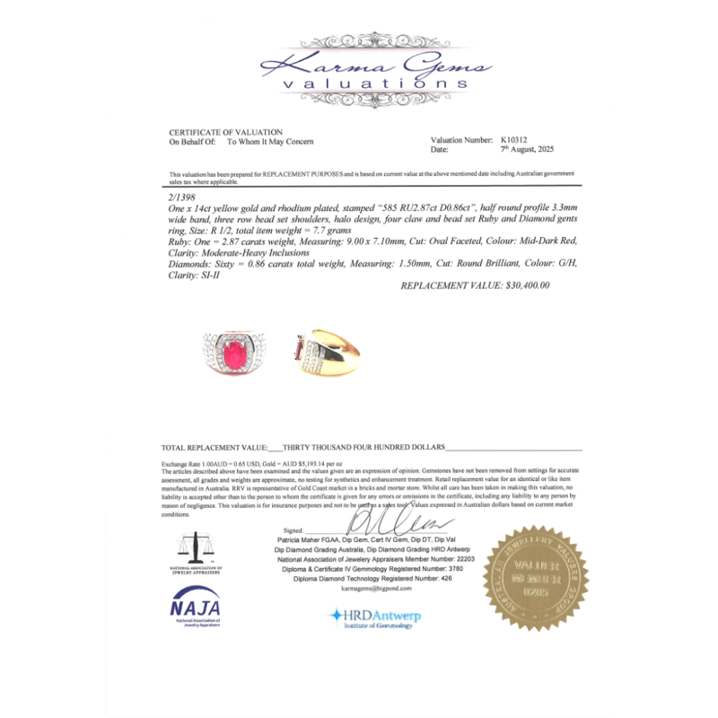 14K YELLOW GOLD, RUBY AND DIAMOND, GENTS RING. The Centre Features, One Oval Cut, Ruby (2.87Ct, Moderate-Heavily Included), Claw Set. Surrounding The Centre And Decorating The Band Are, 60 Round Brilliant Cut, Diamonds (0.86Ct Tdw, G-H Colour, Si-I1 Clarity, ), Micro-Claw Set. Ring Size R 1/2. Valuations Provided by an Independent Third-Party Professional Not Directly Associated With Lloyds Auctions at AUD $$30,400.00This valuation has been conducted by an independent third-party professional. The valuation amount is an assessment by the issuing valuer and does not reflect the auction value of the item. Any inquiries regarding the valuation should be directed to the issuing valuer (refer to contact details on the certificate), as Lloyds Auctions has no affiliation or influence over the valuation, the valuer, or the stated amount. Condition: Good - Refer Images 0645904+5037