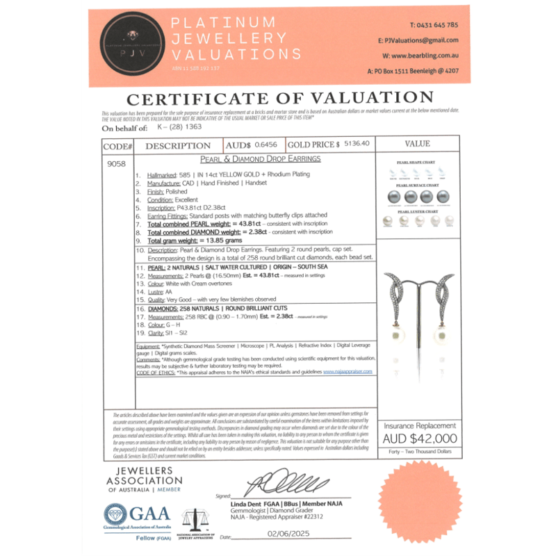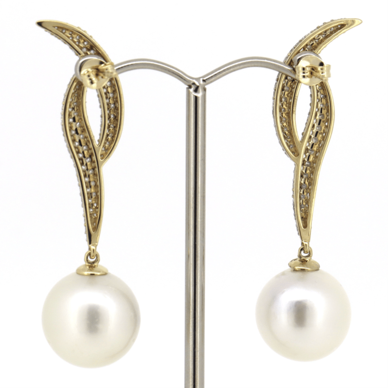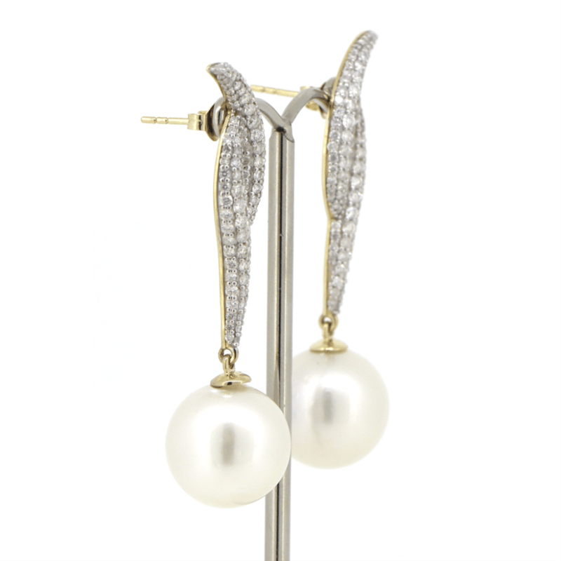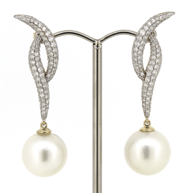 The Earrings Feature, 2 Round White With Silver Overtones, Cultured South Sea Pearls (43.81Ct Tsw, 16.50Mm, Aa Lustre, Very Few Blemishes), Cap Set. Decorating The Bail Are, 258 Round Brilliant Cut, Diamonds (2.38Ct Tdw, G-H Colour, Si1-Si2 Clarity), Bead Set. The Earrings Feature Butterfly Clasps.