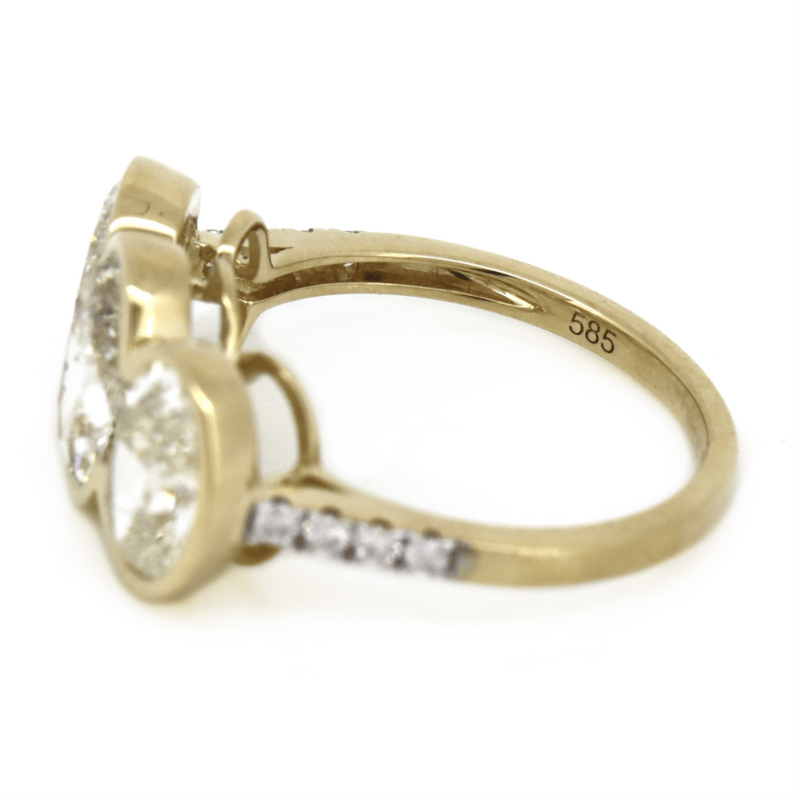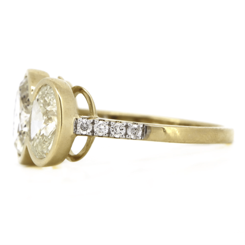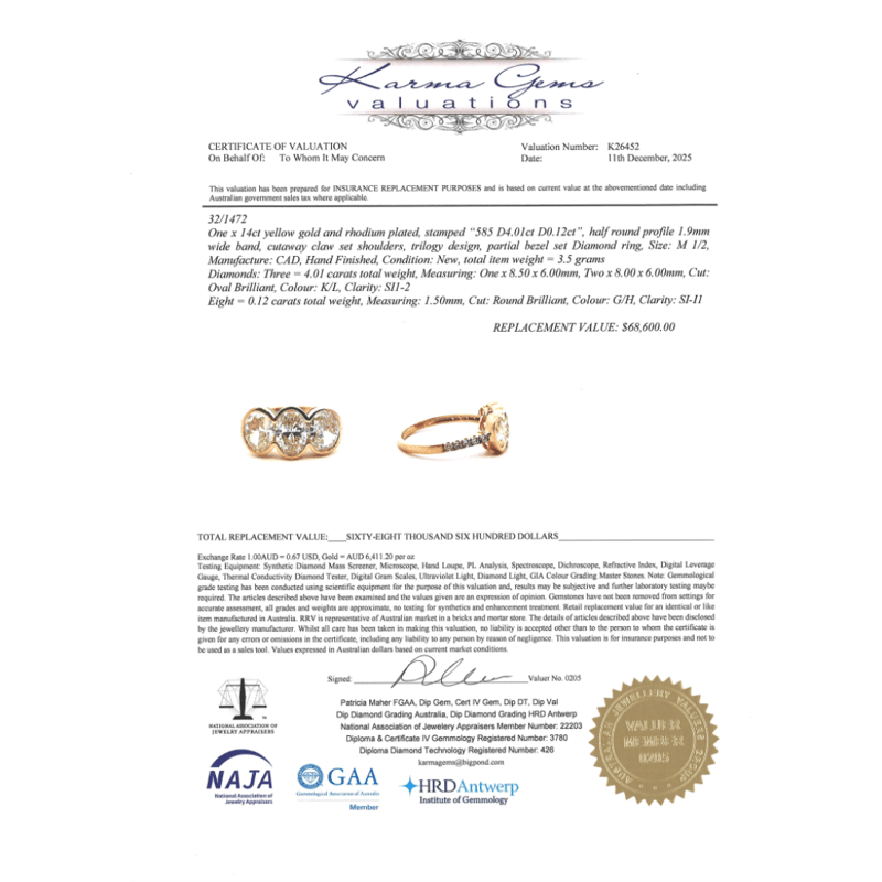 The Centre Features, 3 Oval Brilliant Cut, Diamonds (4.01Ct Tdw, K-L Colour, Si1-2 Clarity), Partial Bezel Set. Decorating The Band Are, 8 Round Brilliant Cut, Diamonds (0.12Ct Tdw, G-H Colour, Si-I1 Clarity), Micro-Bead Set. Ring Size M 1/2.