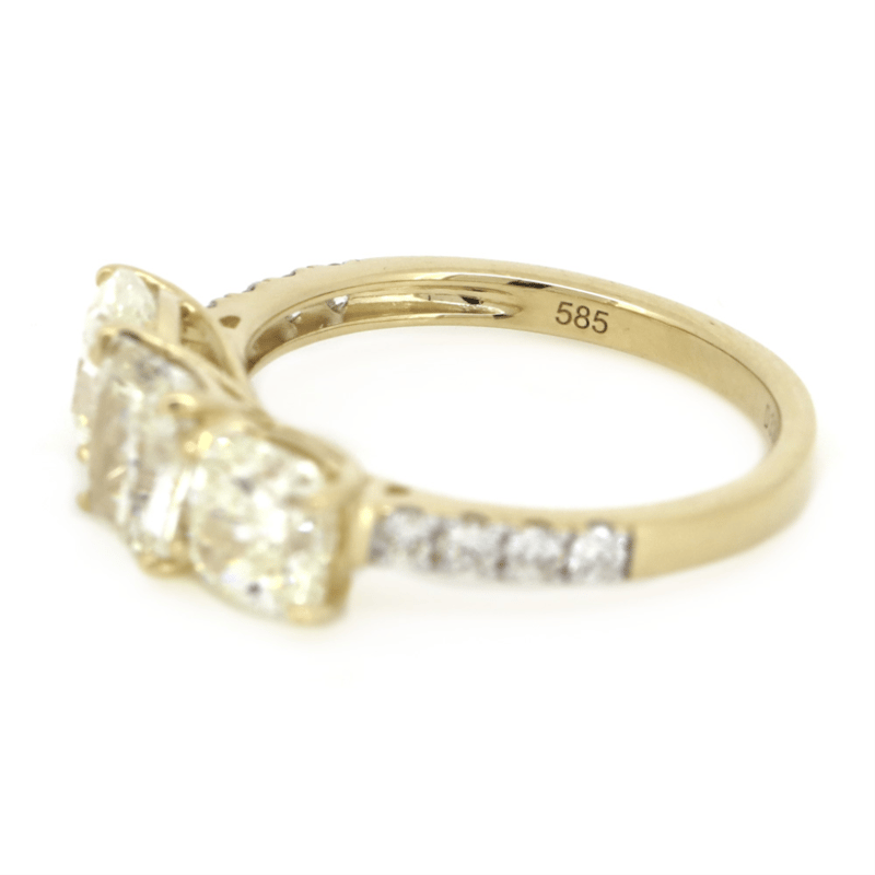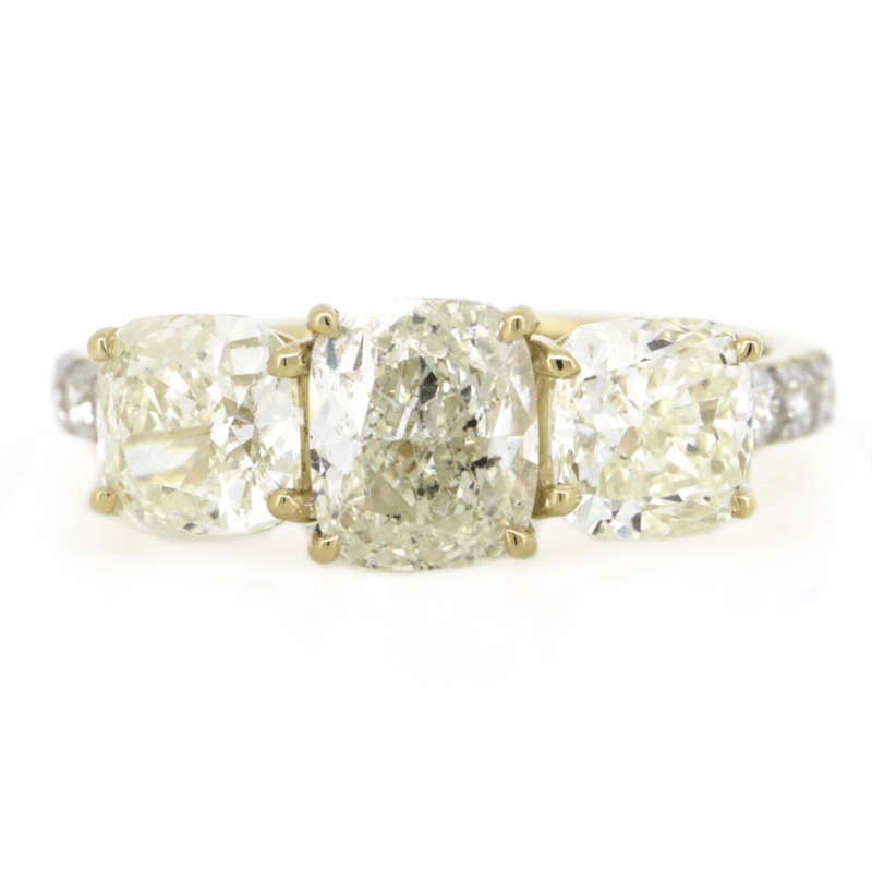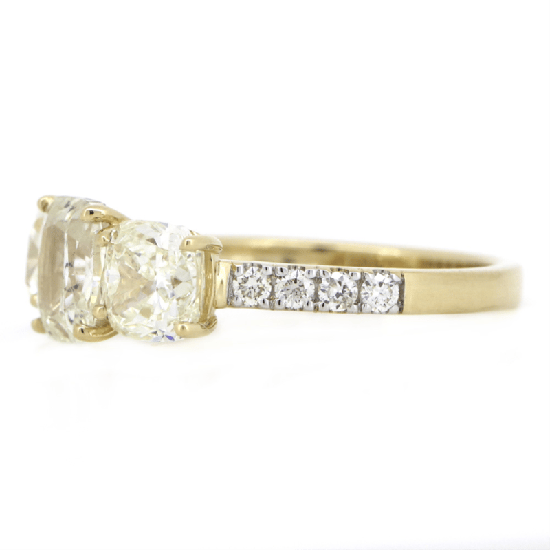 The Design Features, 3 Cushion Cut, Diamonds (3.24Ct Tdw, L-M Colour, Si1-2 Clarity), 4 Claw Set. Decorating The Shoulders Are, 8 Round Brilliant Cut, Diamonds (0.20Ct Tdw, H Colour, Si1 Clarity), Bead Set. Ring Size M 1/2.