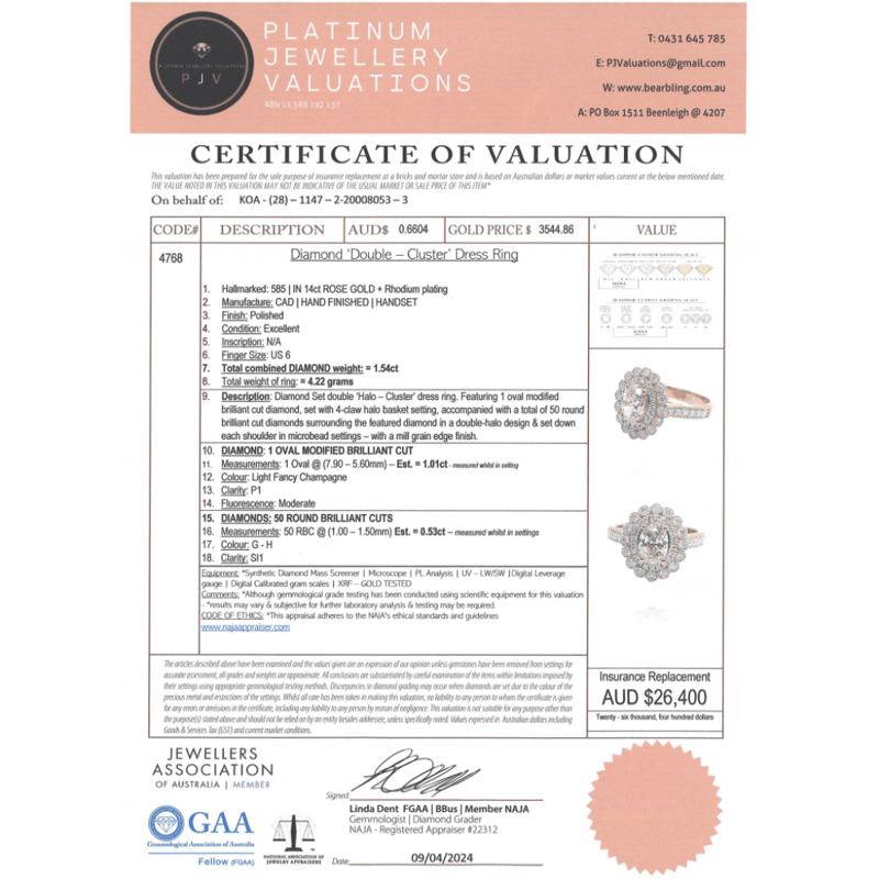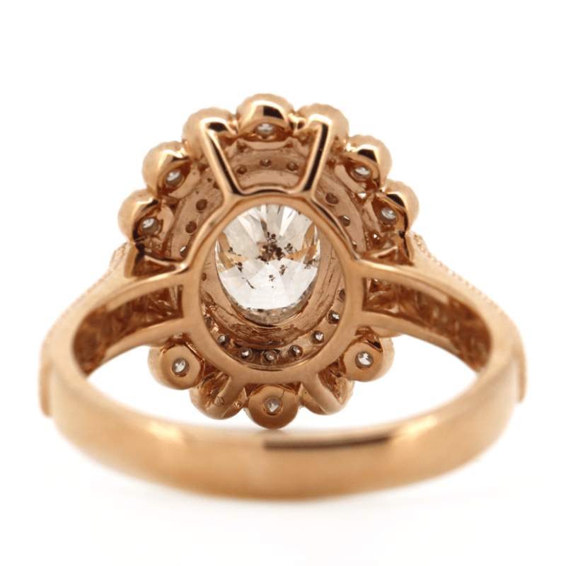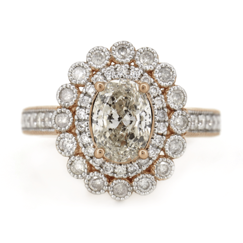 The Centre Features, One Oval Brilliant Cut, Light Fancy Champagne, Diamond (1.01Ct, P1 Clarity), Claw Set. Surrounding The Centre In A Double Halo And Decorating The Band Are, 50 Round Brilliant Cut, Diamonds (0.53Ct Tdw, G-H Colour, Si1 Clarity), Bead Set With Millegrain Detail. Ring Size L 1/2.