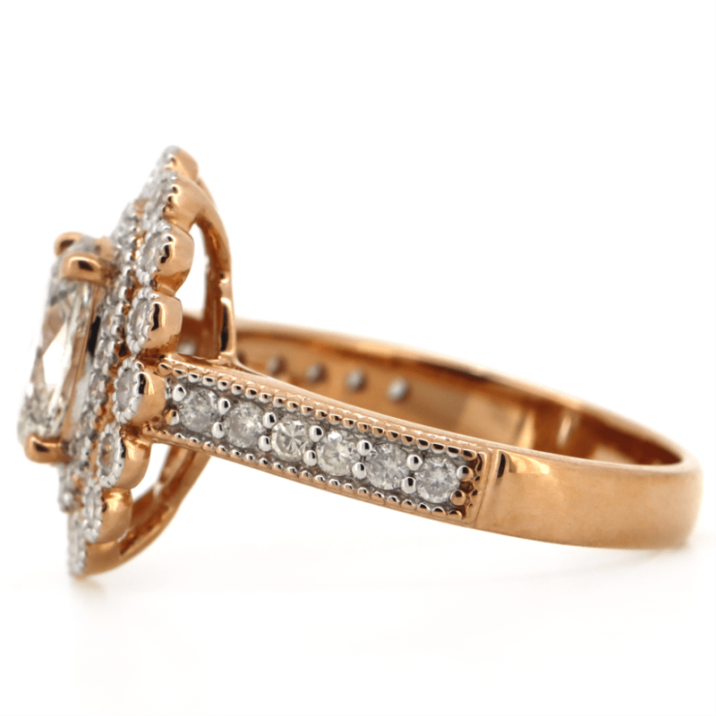 14K ROSE GOLD, FANCY CHAMPAGNE DIAMOND AND DIAMOND, DOUBLE HALO RING.