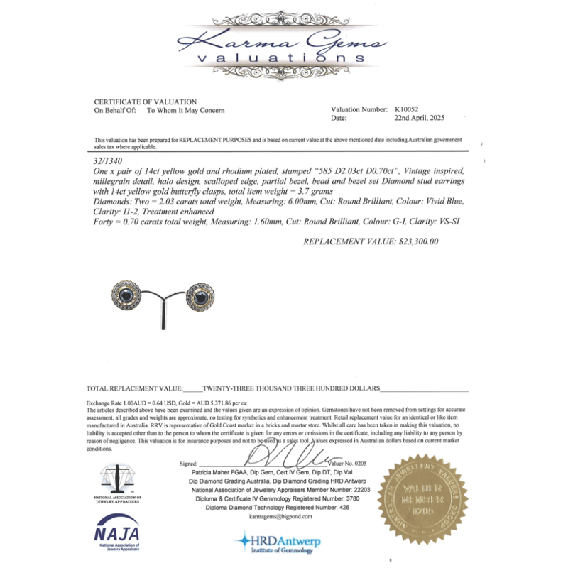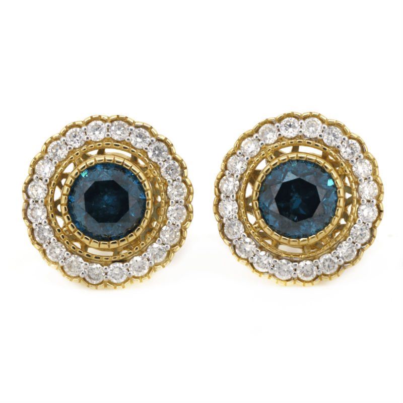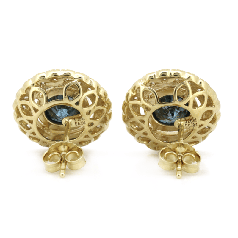 The Centres Feature, 2 Round Brilliant Cut, Vivid Blue, Diamonds (2.03Ct Tdw, I1-I2 Clarity, Enhanced), Bezel Set. Surrounding The Centers In Halos Are, 40 Round Brilliant Cut, Diamonds (0.70Ct Tdw, G-I Colour, Vs-Si1 Clarity), Bead Set. The Earrings Have Post Backs, With 14K Yellow Gold Butterfly Clasps.