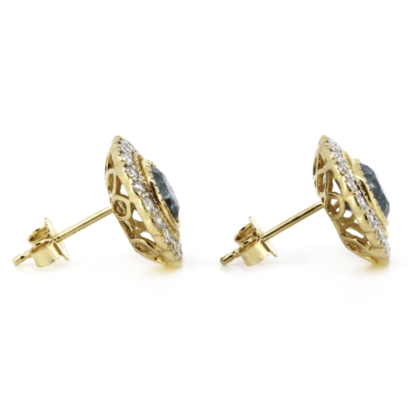 14K YELLOW GOLD, BLUE DIAMOND AND DIAMOND, HALO STUD EARRINGS.