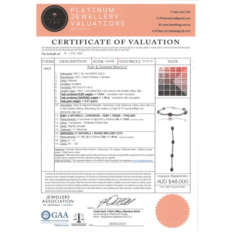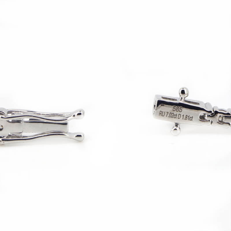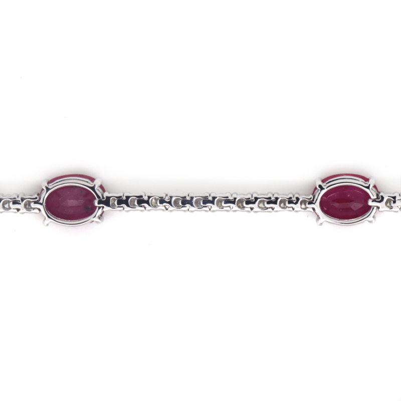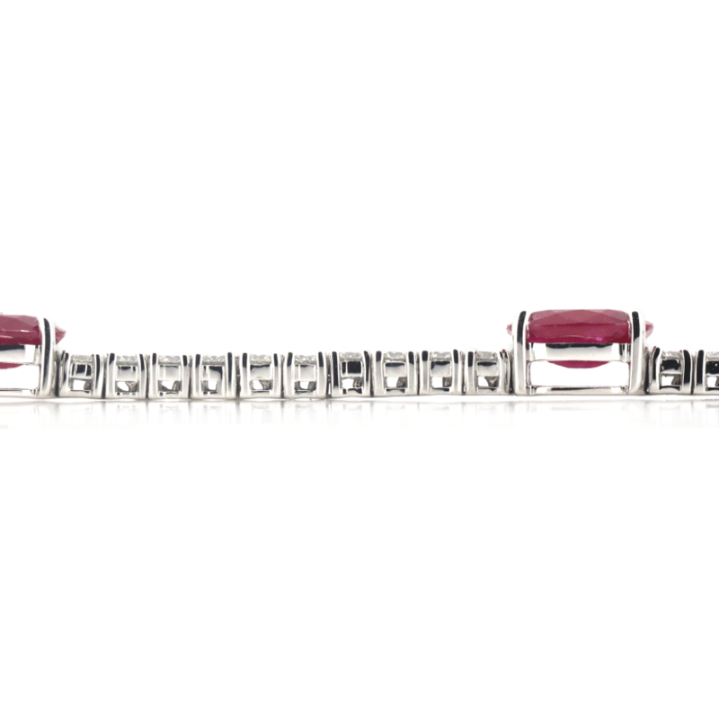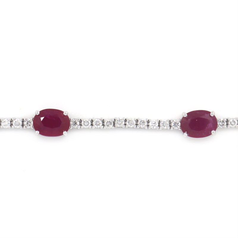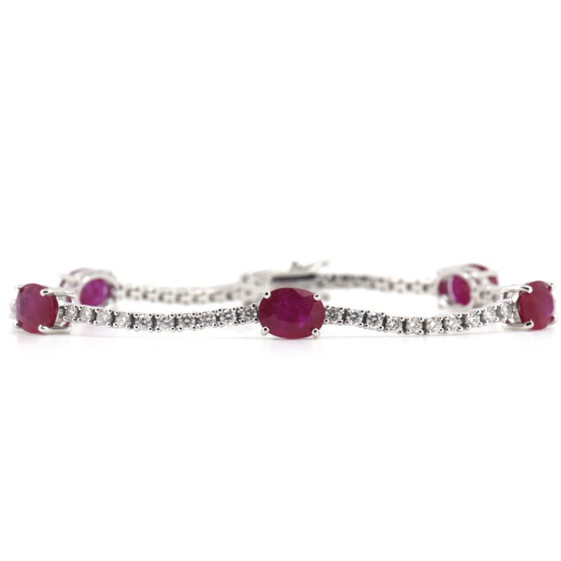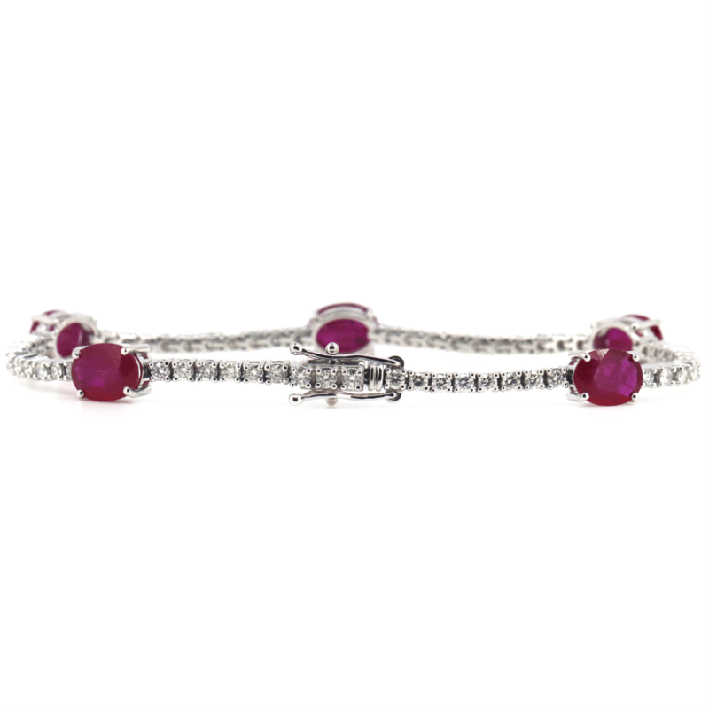 The Design Features 5 Oval Cut, Red, Rubies (7.02Ct Tsw, Slightly Included), Claw Set. Alternating The Rubies Are, 57 Round Brilliant Cut, Diamonds (1.81Ct Tdw, G-H Colour, Si1-Si2 Clarity), Claw Set. The Bracelet Has A Hidden Box Lock Closure With 2 Safety Clips. Bracelet Length Is 19Cm.