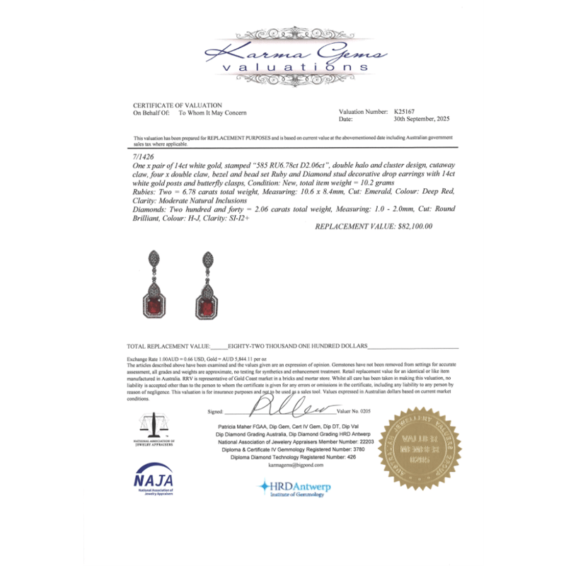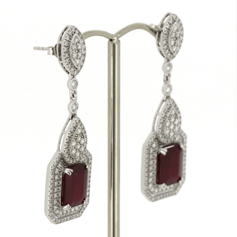 The Centres Feature, 2 Emerald Cut, Deep Red, Rubies (6.78Ct Tsw, Moderate Included), Double 4 Claw Set. Decorating The Designs Are, 240 Round Brilliant Cut, Diamonds (2.06Ct Tdw, H-J Colour, Si-I2+ Clarity), Bead Set. The Earrings Have Post Backs With, 14K White Gold Butterfly Clasps.
