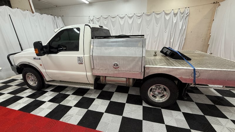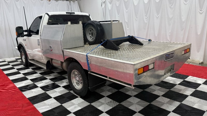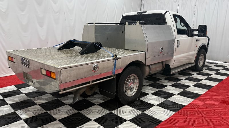 A heavy-duty Ford F‑350 single cab chassis powered by the renowned 7.3‑litre V8 turbo diesel engine paired with an automatic transmission. Rear-wheel drive (2x4) configuration with seating for two, odometer indicating 382,876 kilometres.