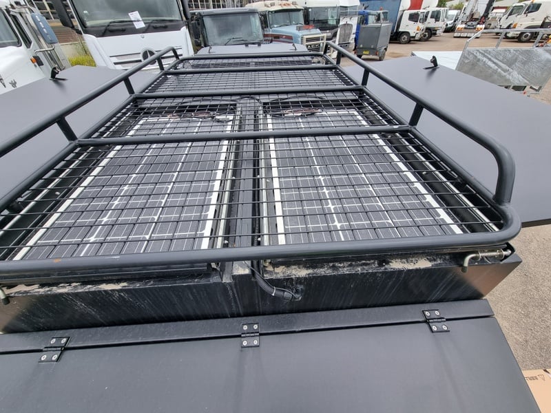 Under trailer water tank and draw bar mounted tap with internal water gauge, Solar panel roof mounted with slide out access, with regulator, 2000w inverter and 30 Amp DC charger, Radio with speakers, Alarm system with remote control, 50L fridge included, Roof rack with side ladder for easy access