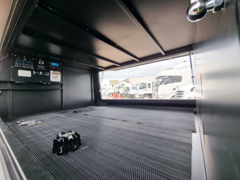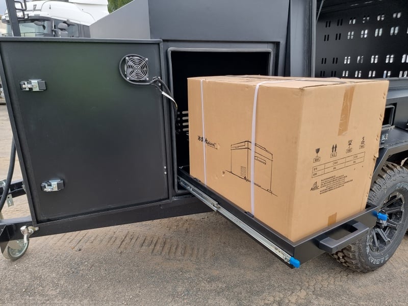 Unused Tradie Trailer, MAXI Premium Package Off Road, Only 1780 kg so easy to tow, ATM: 3500 kg, 2.15m wide x 5.20m long plus draw bar – plenty of room for your tools, 16 inch 4WD rims and tyres 265/75R16 – more stable towing plus spare tyre drawbar mounted, Electric brakes on 4 wheel electric brakes, 4x Independent suspension with dual shocks and springs, Lockable and secure – keep your tools safe, Remote control Alarm, External light and Internal lighting, 2 x Deep cycle Batteries and 12v charging access ideal for phones etc, Underfloor storage draws 2 x 1500x500 slide out, Heavy duty steel fridge slide, 3.5t tow hitch, Anderson plug, Internal switch panel, 240v Power outlet inside, 240v outlet and inlet, Internal and external storage compartments