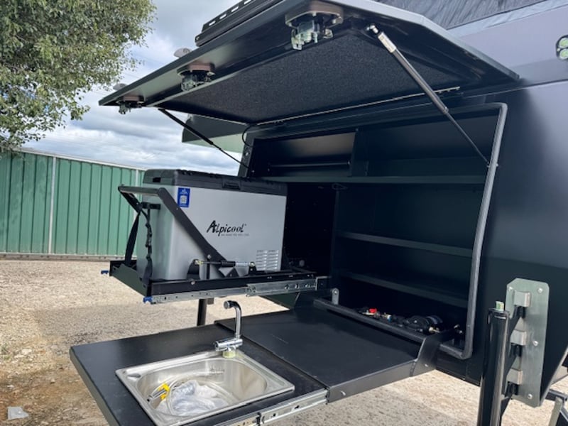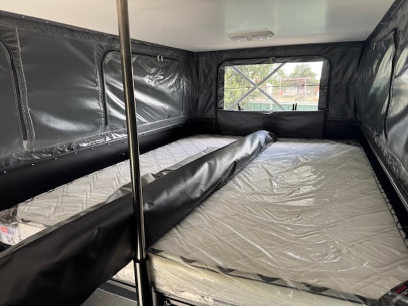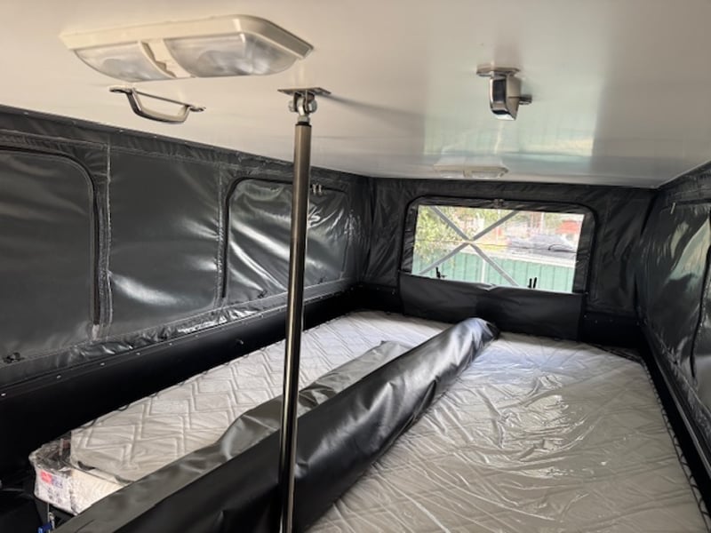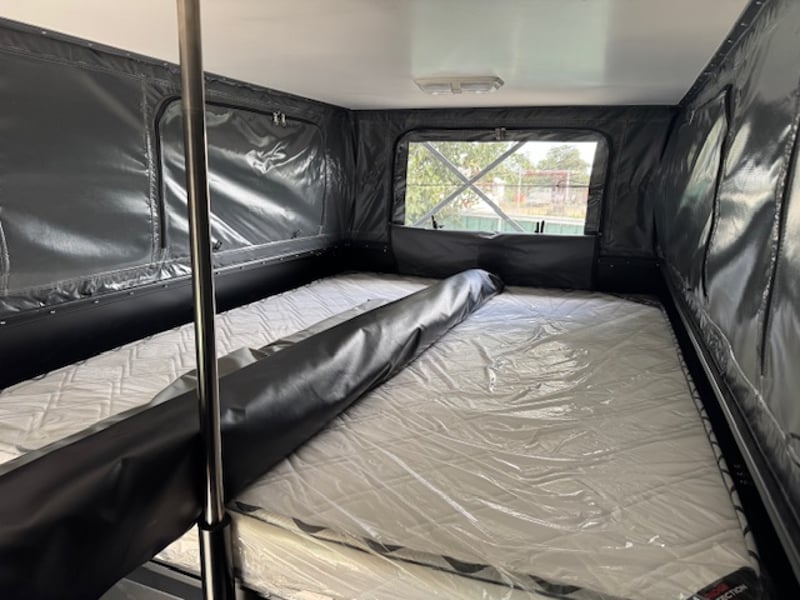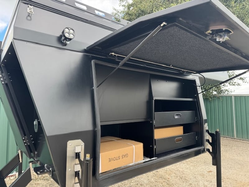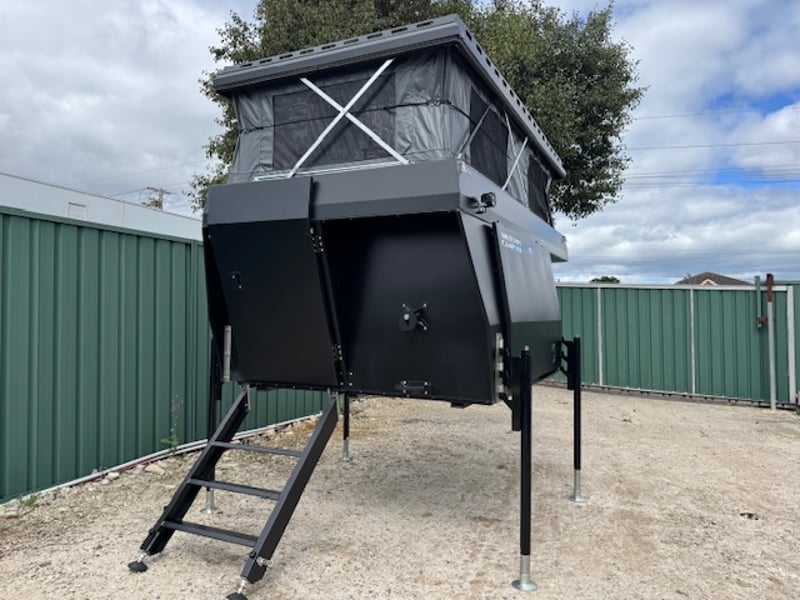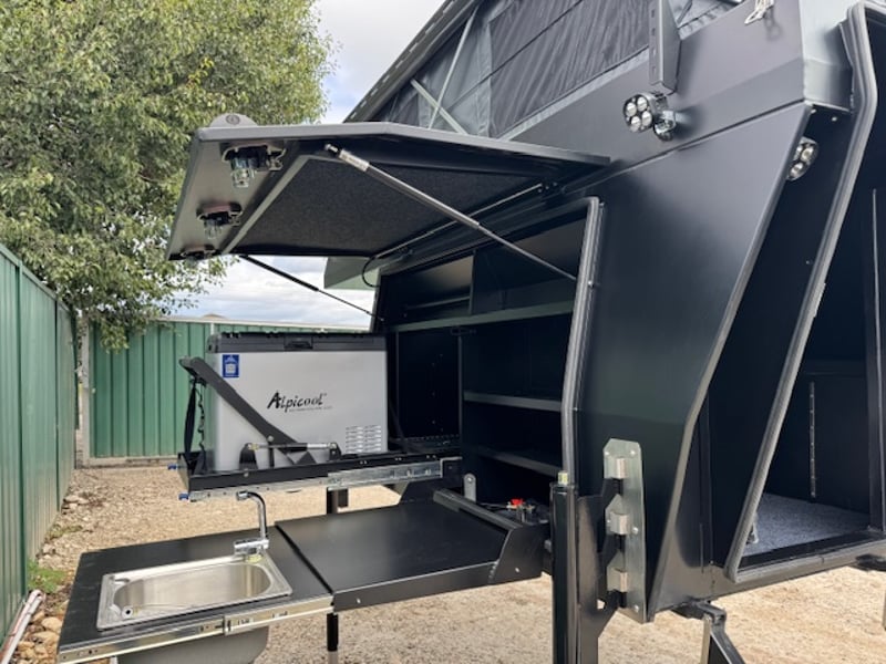 Description/Extras: Chassis: Aluminium Chassis and frame light weight, Stabilizer legs & Wheels: 4 x Adjustable legs (lifting camper) free standing, Camper Details: Simple setup, it only takes you around 90 seconds to setup the main tent, Self-supporting modern design, High Strength Aluminium Frame, Door: Entry door with locks, All doors are lockable & fully sealed to prevent water & dust ingress, Interior & Features: Stainless steel sink with fold away tap, AGA approve 4 burner gas stoves with quick connection (moveable) cook inside or outside , Wind Protector, 200 Litre food grade plastic water tank, High pressure electric water pump with quick release connector, Lighting system: 1 x LED light each side door, 2x dome lights, 3x spotlights outside body, Water system, 1x electric water pump, 1x water filter, 1 x tap, Electric system: 2x Deep Cycle Battery 100AH, 2000watt inverter 240v, 30Amp DC Battery Charger, Additional Features: 50L fridge, Aluminium ladder, Pulling and lifting fridge drawer, Portable toilet, 200w solar panel, 8L cheap water heater , Bed: 2000mm x 1500mm coil spring mattress