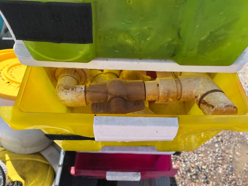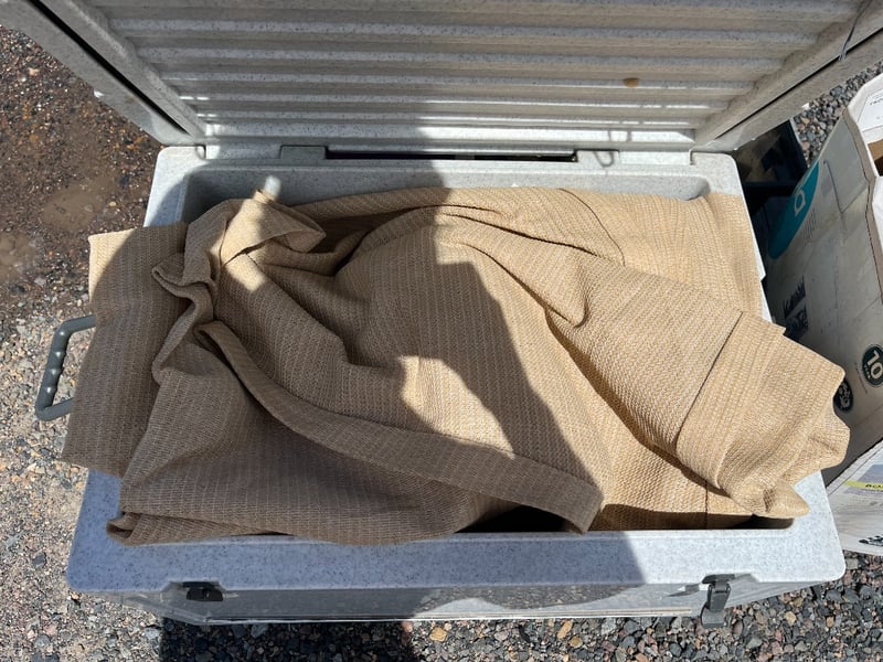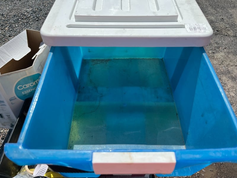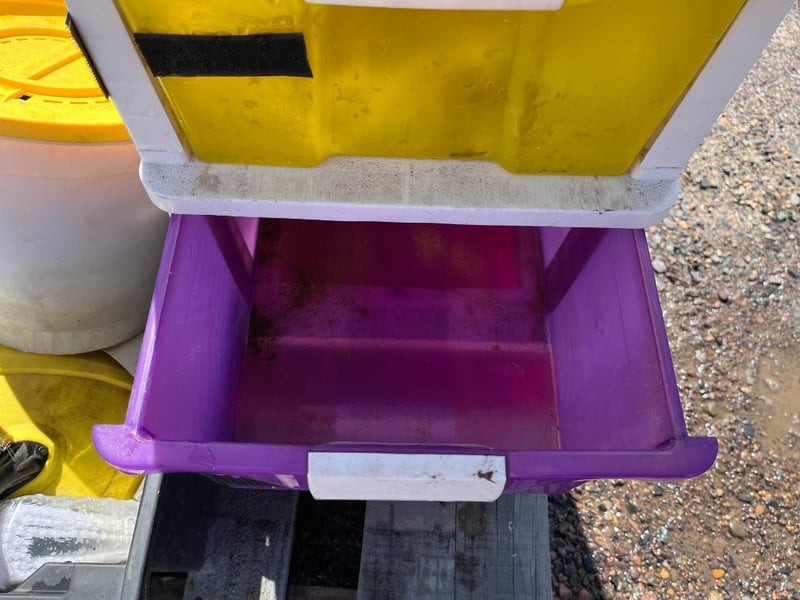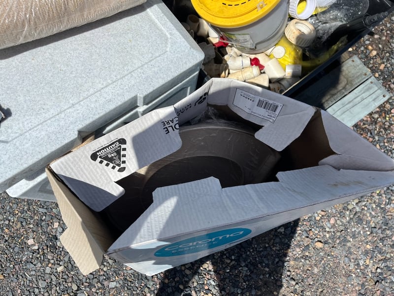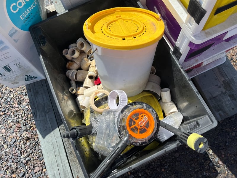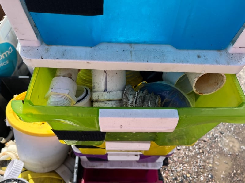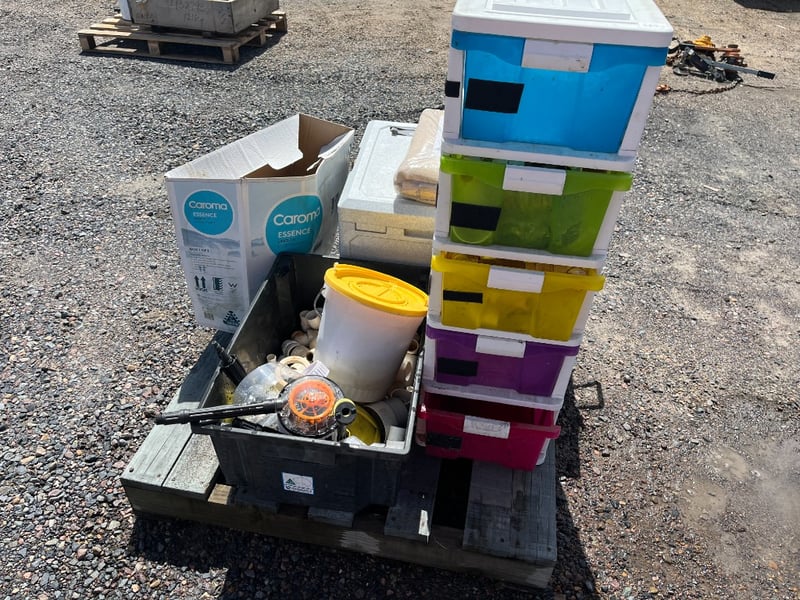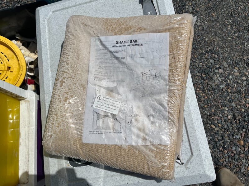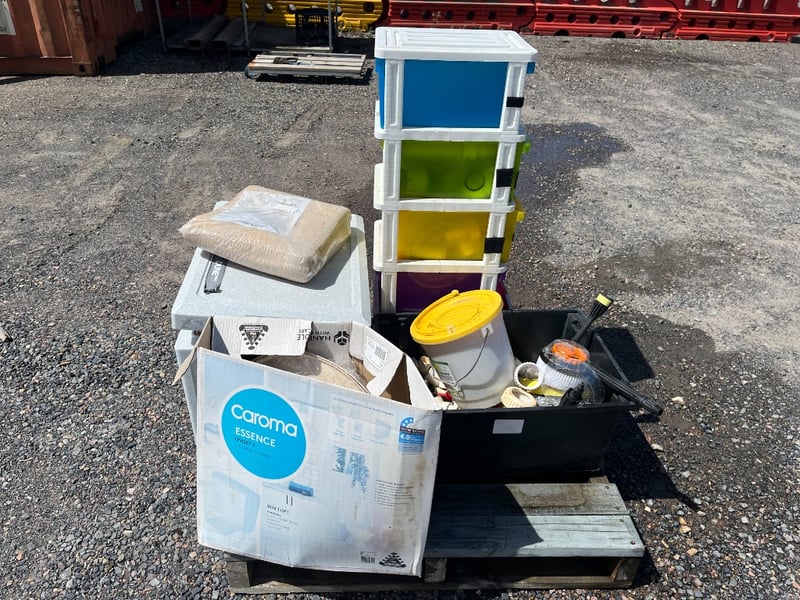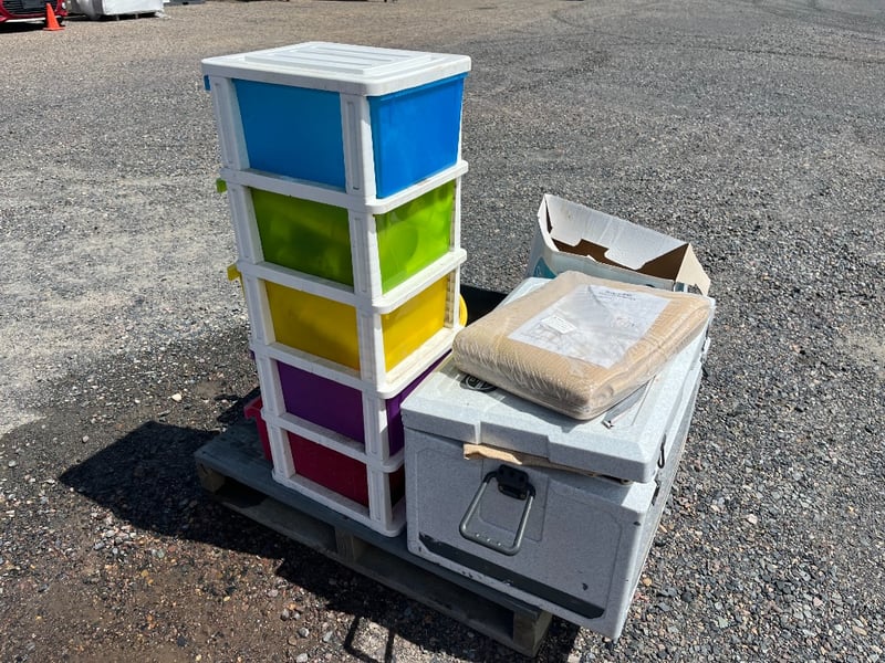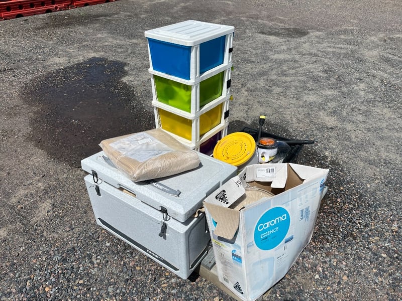 Description: 5 draw storage, tap/hose fittings, 2 x shade sails (1 x new, 1 x opened), toilet seat, esky, gurnie fittings.