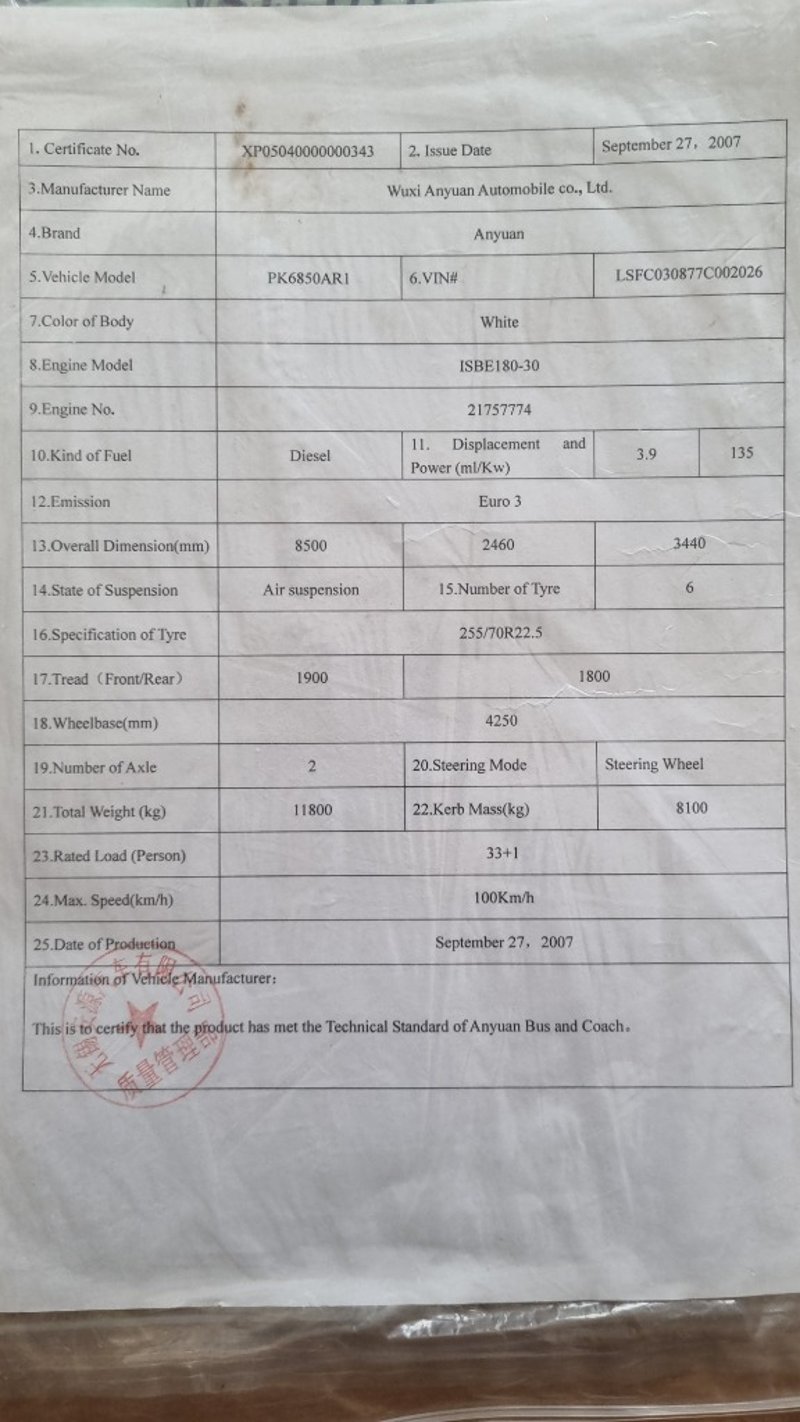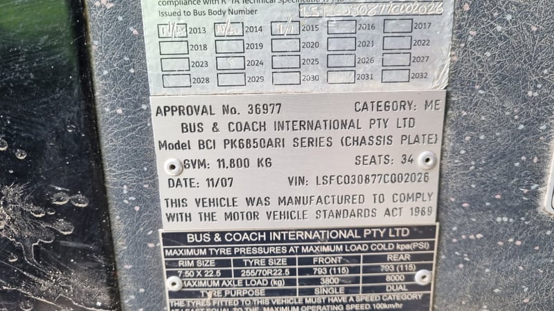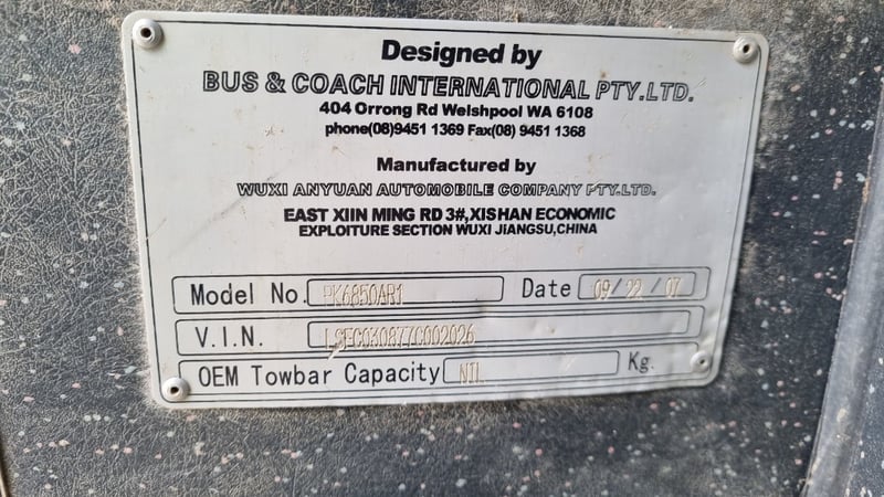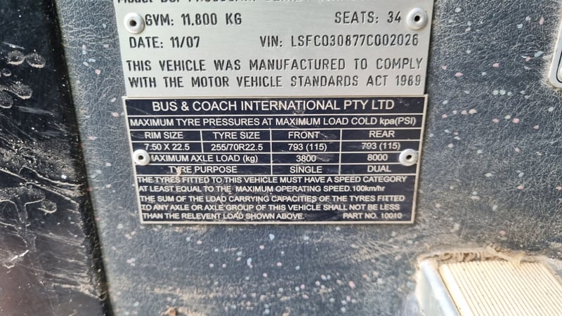 2007 – Bus & Coach International (BCI) – PK6850AR1 – Coach Year: 2007 Make: Bus & Coach International (BCI) Model: PK6850AR1 Body: Coach Configuration: 6 Speed Manual Seats: up to 34 ( Seats Removed For Conversion) Odometer Indicated: 279837Km/h Transmission: 6 Speed Manual Suspension: Air Bag Engine: 3.9L 135kw Cummins Turbo Diesel Engine Number: 1SBE1803021757774 AS PER PPSR VIN: LSFC030877C002026 Description/Extras: Seats Removed ready for Motor Home Conversion, Recently Serviced, Automatic Door, under bus Storage, Reverse Camera, Service and Instruction Books Damage: Marks And Scratches Passenger, Seats Not Fully Bolted in, Some External Locks Stuck GVM: 11,800 kgs As Standard Auction Practice all Vehicles are Sold Unregistered LOCATION: #CTM