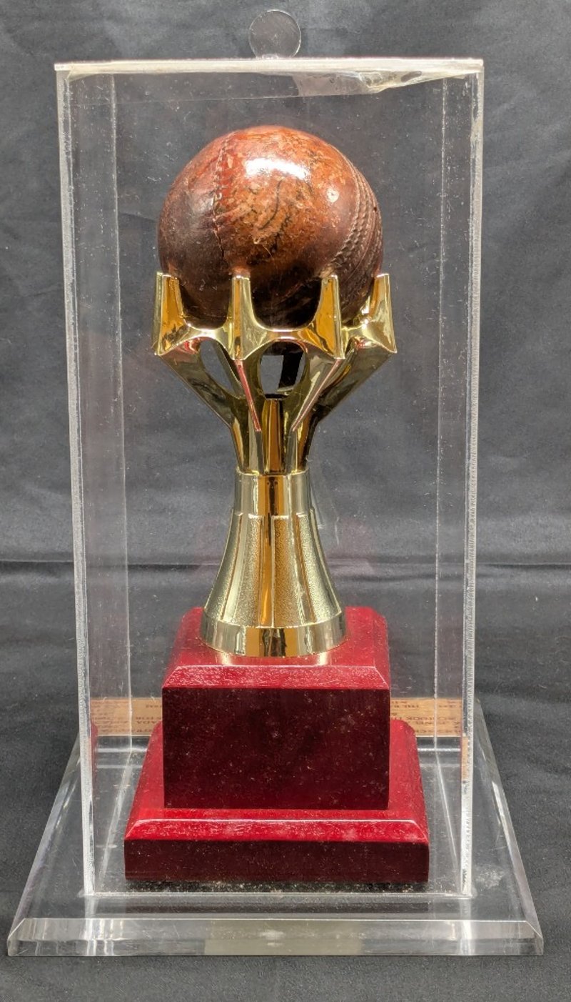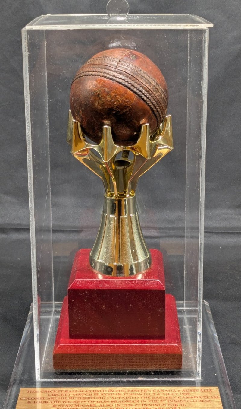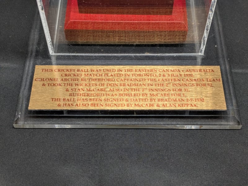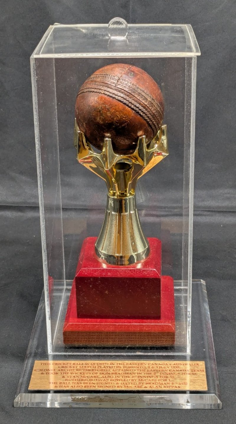 DON BRADMAN, STAN MCCABE, AND ALAN KIPPAX SIGNED CRICKET BALL Item Size: Height: 27cm, Width: 16cm, Depth: 20cm Cricket Ball Was Played During The Canada Vs Australia Cricket Match In Toronto 2 & 3 July 1932 Cricket Ball In A Plastic Sealed Casing Condition: Good - Refer To Images 584403+1
