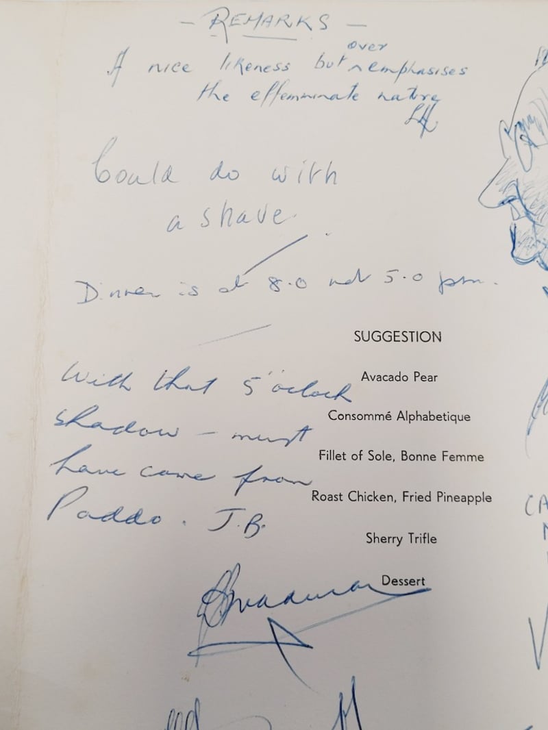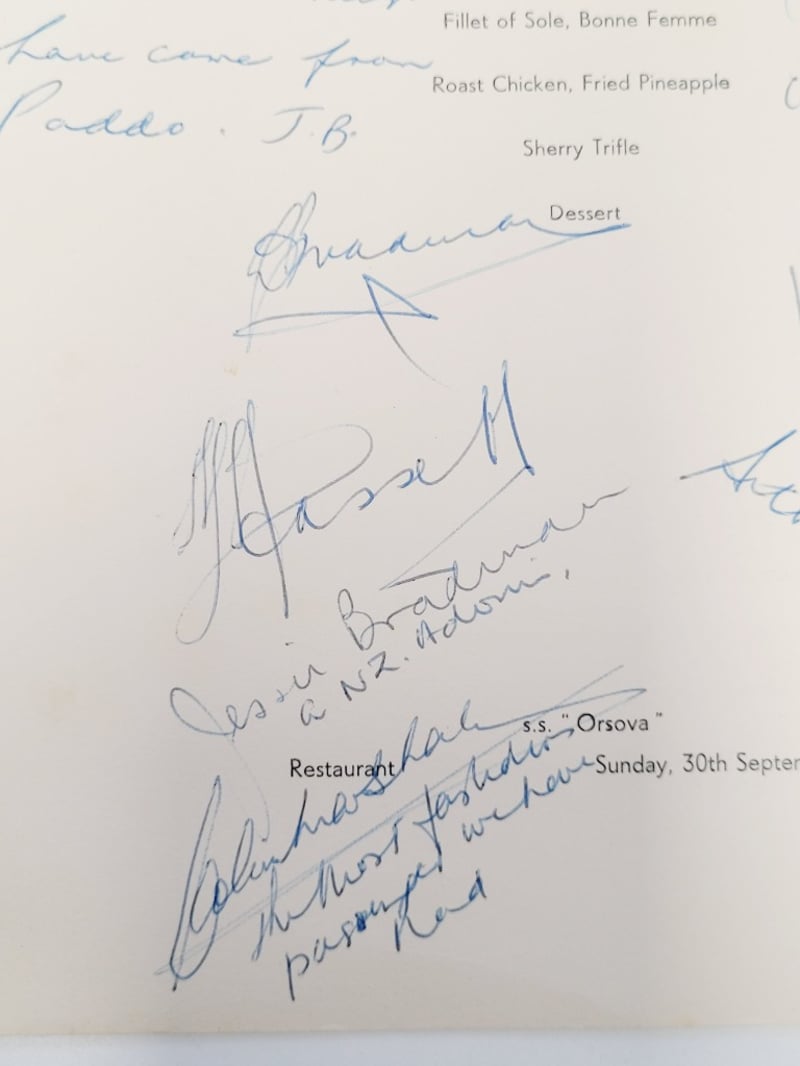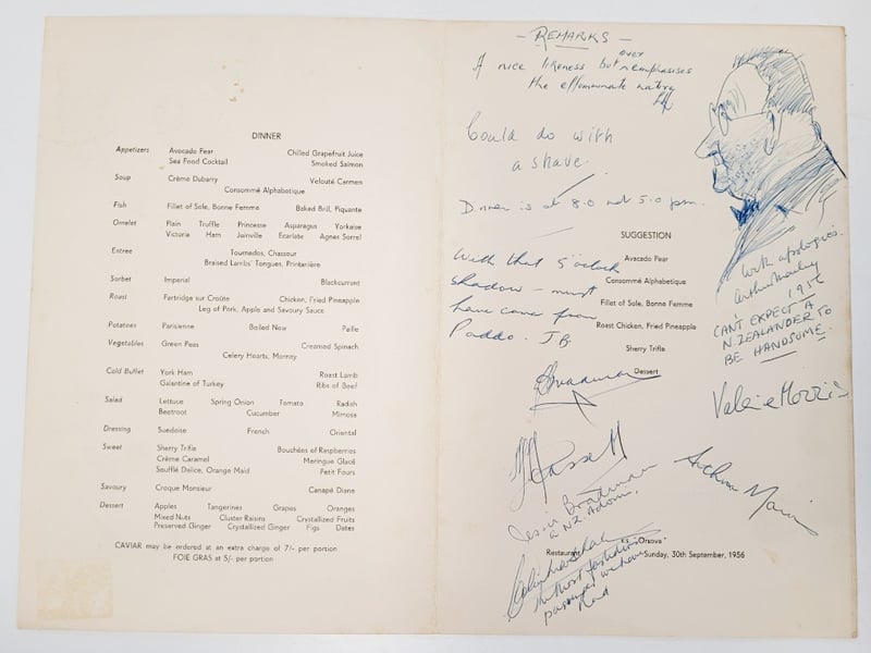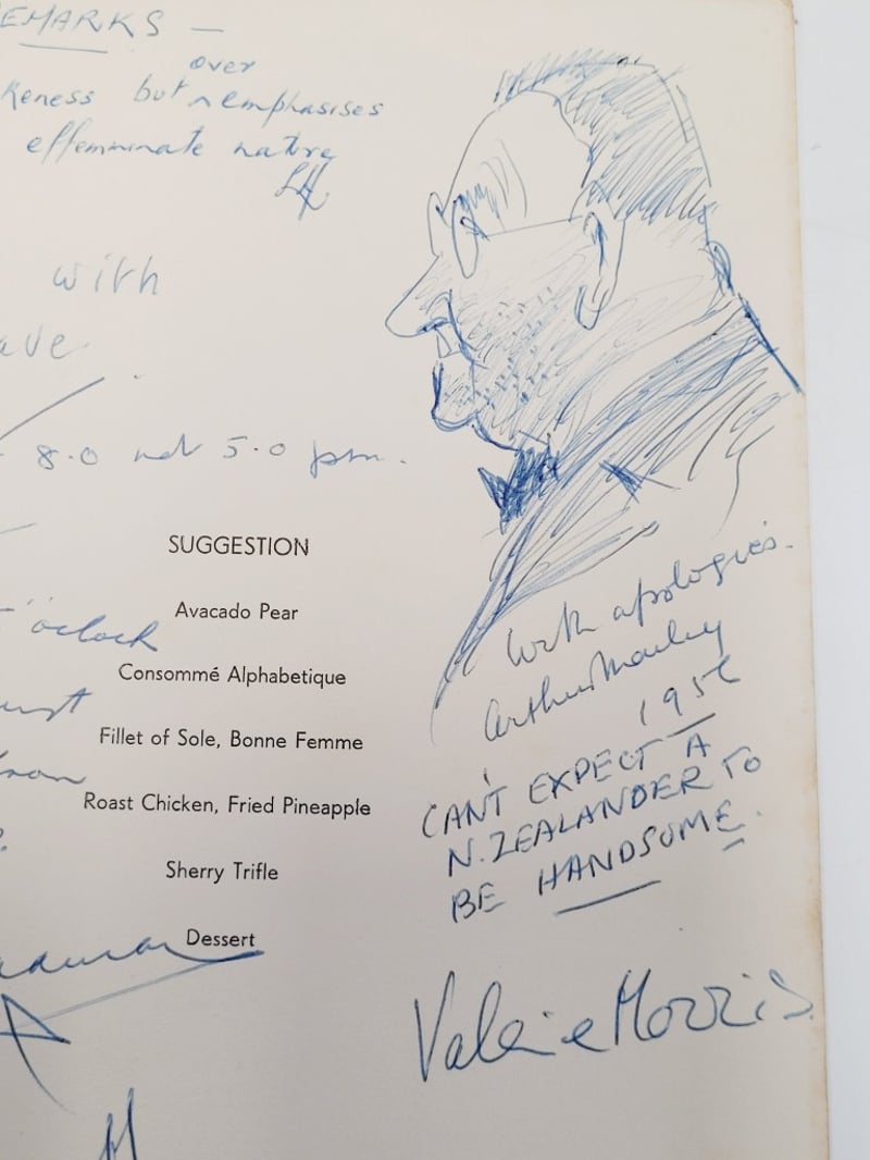 Original 1956 Tour Menu Featuring Sketches By Arthur Mailey With Comments By Jessie And Sir Don Bradman. Captured At A Table With Arthur & Valerie Morris And Lindsay Hassett. From The Arthur Morris Collection, A Rare, Intimate Piece Of Australian Cricket History.