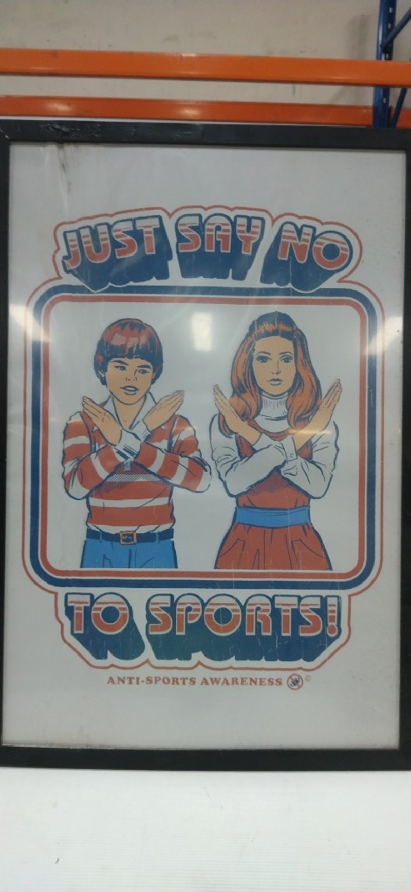Framed poster titled "Just Say No To Sports" by Australian graphic artist Steven Rhodes 1970s style