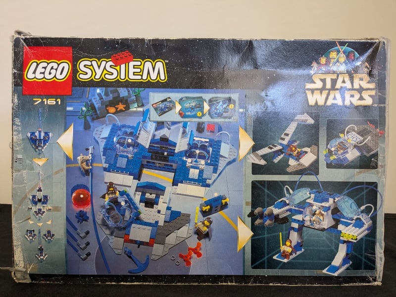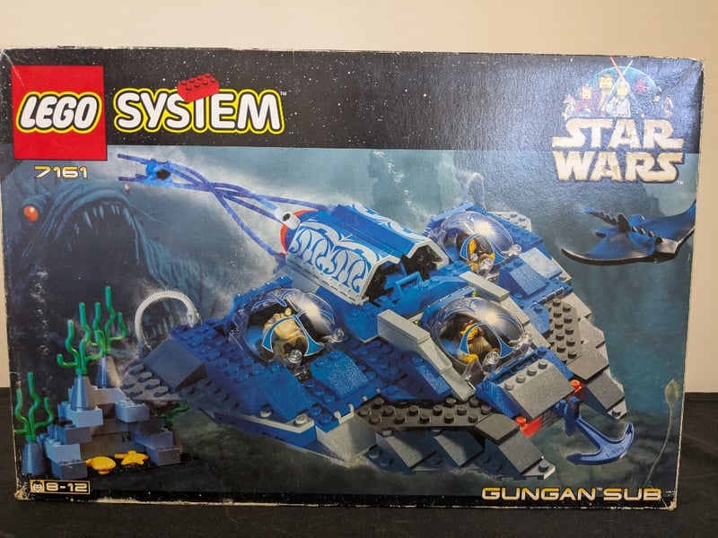 Vintage Lego System Star Wars Set 7161 Gungan Sub, Featuring The Iconic Blue Submarine Vessel With Opening Cockpit, Pilot Seats For Multiple Minifigures, And Motorized Propulsion System. Original Box Shows Retail Packaging With Comprehensive Product Photography. Includes Minifigures And Underwater Terrain Accessories. Box Exhibits Substantial Wear Consistent With Age And Storage, With Creasing And Scuffing To Cardboard Surfaces. This Early 2000S Collectible Represents A Significant Piece Of Star