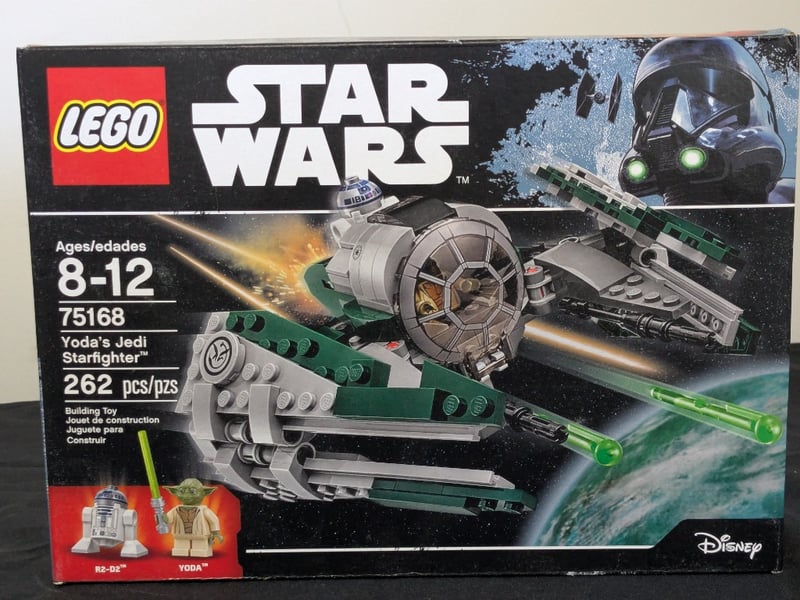 Lego Star Wars Set 75168 Featuring Yoda'S Jedi Starfighter. This 262-Piece Building Set Includes Minifigures Of Yoda And R2-D2, Along With A Detailed Starfighter Model With Green And Grey Coloring, Opening Cockpit, And Articulated Wings. Designed For Ages 8-12. Packaging Shows Minor Wear Consistent With Age And Storage. Includes Original Box With Printed Instructions Visible.