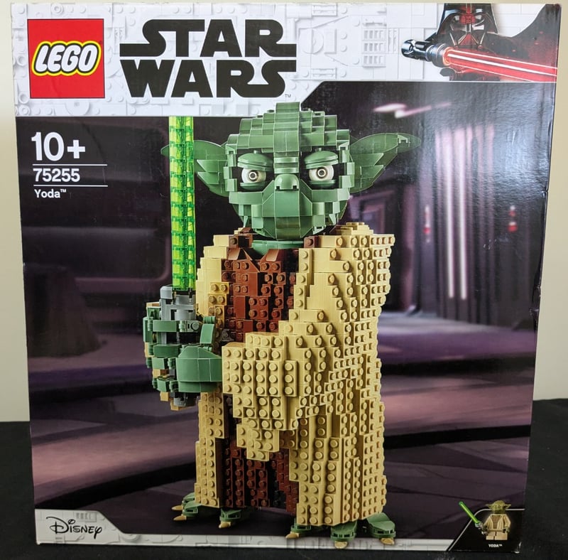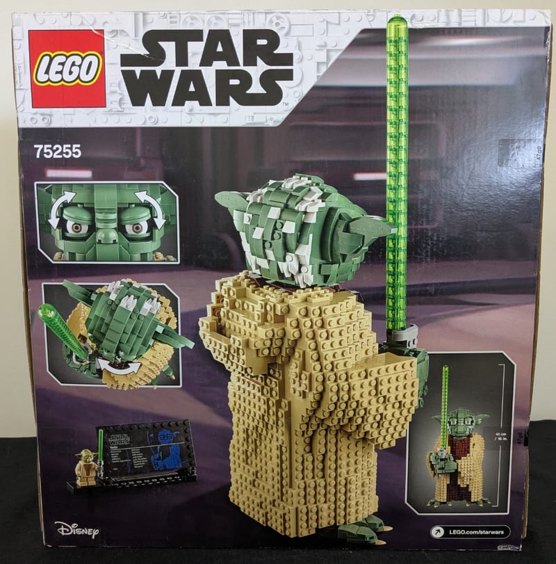 Lego Star Wars Yoda Set 75255, Featuring A Buildable Oversized Brick-Constructed Head With Green And Tan Colored Elements, Articulated Ears, Illuminated Eyes, And Detachable Lightsaber. Includes Minifigure And Display Stand With Height Reference Column. Age 10+. Original Packaging With Imagery And Specifications Shown.