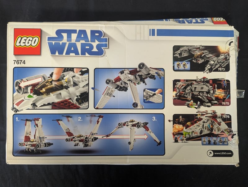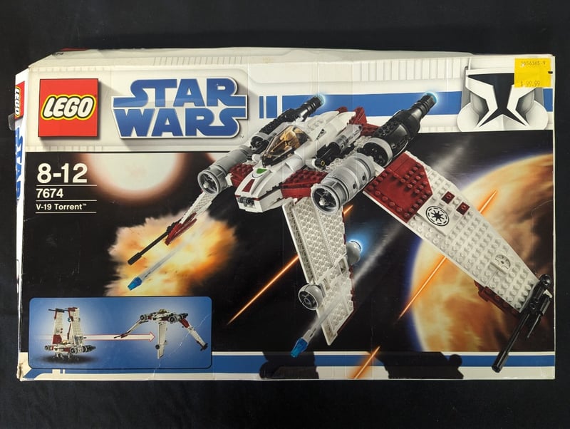 Lego Star Wars V-19 Torrent Starfighter Set 7674 (Ages 8-12). Features Poseable Spacecraft With Rotating Cockpit, Dual Laser Cannons, Retractable Landing Gear, And Detailed Republic Insignia. Original Box With Complete Construction Instructions. Includes Minifigures And Accessories. Three Transformation Configurations Shown. Vintage Early 2000S Clone Wars Era Set.