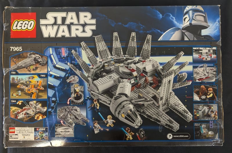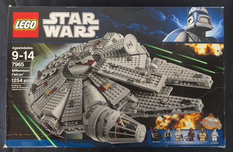 Vintage Lego Star Wars Set 7965 Millennium Falcon (1254 Pieces) Featuring The Iconic Spacecraft With Detailed Construction, Includes Minifigures Of Han Solo, Chewbacca, Leia, And Clone Trooper. Original Box Shows Wear Consistent With Age. Ages 9-14.