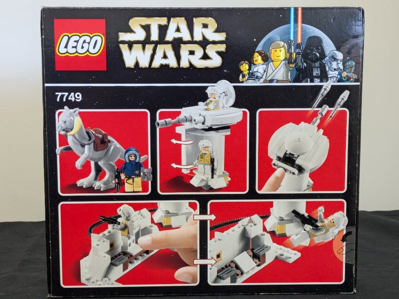 Lego Star Wars Echo Base Set 7749, Featuring Hoth-Themed Minifigures Including A Rebel Soldier And Imperial Stormtrooper, Accompanied By A Poseable Tauntaun Creature. The Set Includes A Modular Base Structure With Defensive Turret, Rotating Dish Antenna, And Articulated Landscape Elements. Original Packaging Displays Assembly Instructions And Component Details On Reverse. Recommended Age Range 7-12 Years.
