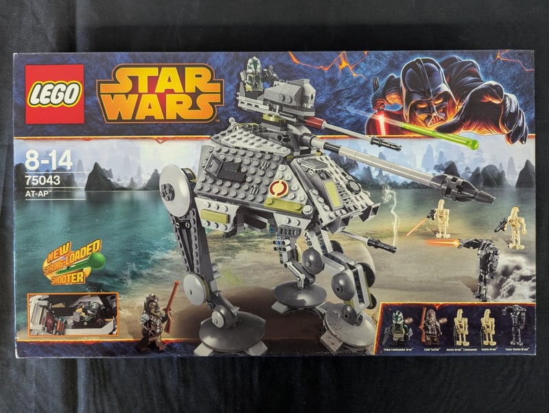 Lego Star Wars Set 75043 Featuring The At-Ap (All Terrain Attack Pod) Walker. This Collectible Construction Set Includes A Detailed Motorized Walker Vehicle With Firing Spring-Loaded Shooters, Articulated Legs, Rotating Turret, And Cockpit. The Set Comprises Minifigures Including Clone Commander, Clone Trooper, Battle Droid, And Dwarf Spider Droid. Original Retail Packaging Shows Age-Appropriate Rating 8-14 Years. Packaging Displays Imagery Of Kashyyyk Setting With Action Sequences. Instructions