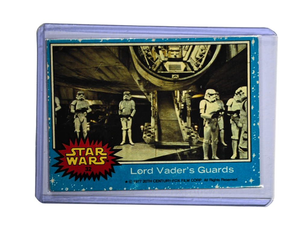 1977 STAR WARS TRADING CARD – “LORD VADER’S GUARDS” (CARD #32)Stormtroopers Stand Ready Beneath The Millennium Falcon In This Early Scene From A New Hope. Card #32 From The Iconic Blue Border Series.- 1977 Topps Star Wars Series- Card #32- Blue Border- Features Stormtroopers And FalconDisclaimer:General Surface Wear Visible584901+57