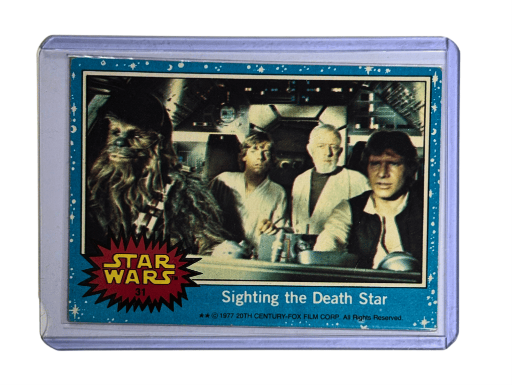 1977 STAR WARS CARD #31 – SIGHTING THE DEATH STARClassic Blue-Bordered Trading Card Featuring Chewbacca, Luke, Obi-Wan, And Han Solo As They First Glimpse The Death Star Aboard The Millennium Falcon. Vintage Magic From The Original Trilogy.- 1977 Topps Star Wars Series- Card #31 – Blue Border- Featuring Main Cast On The Falcon584901+58